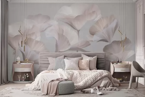 Fototapety Bledě broskvové průsvitné lotosové květy s jemnými okvětními lístky na tlumeném šedém pozadí Č. w09640