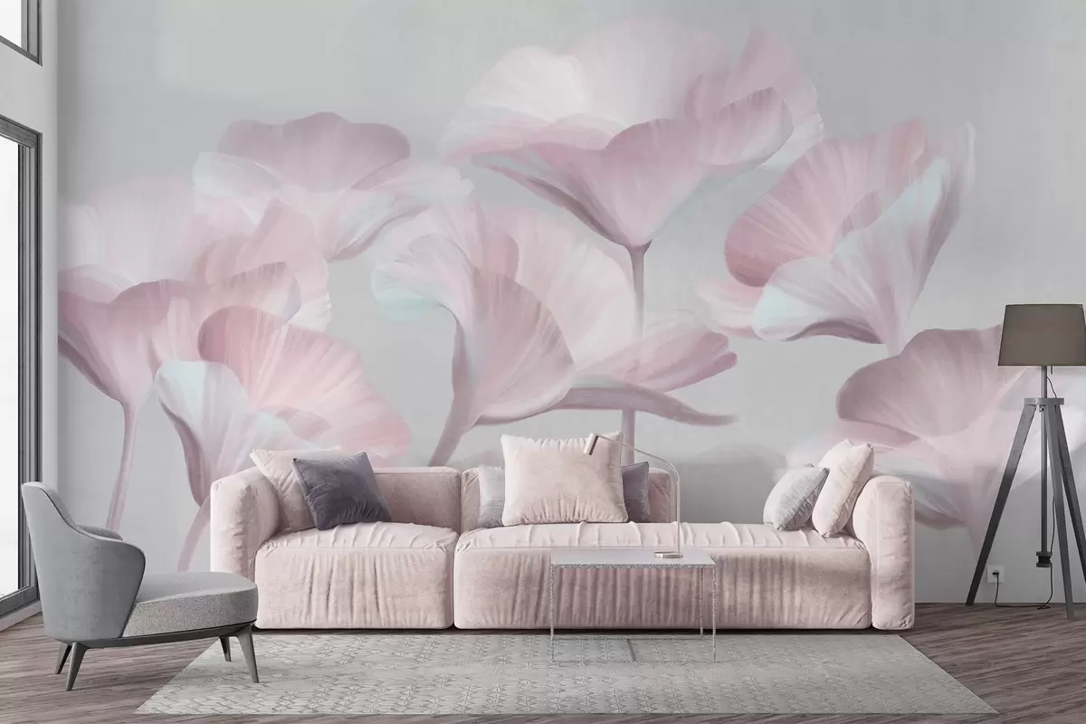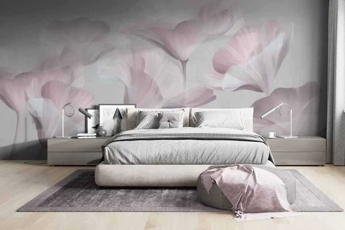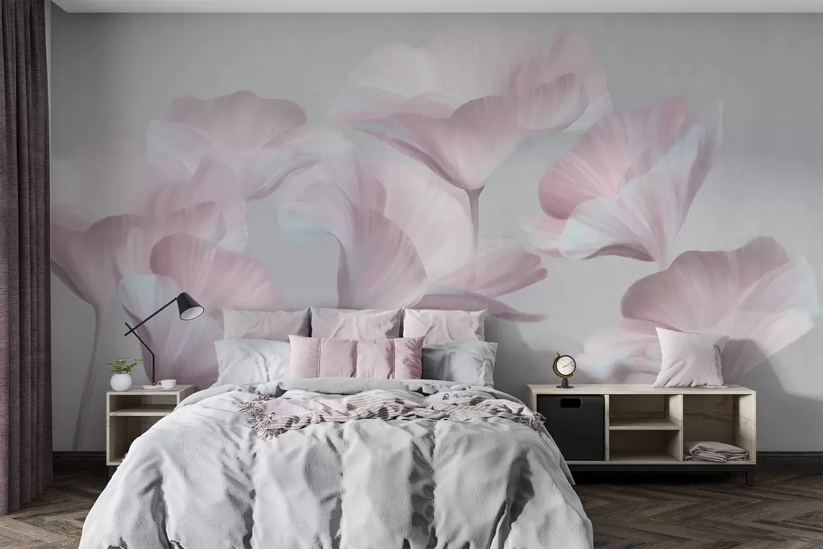 Fototapety Světle růžové texturované průsvitné lotosové květy s jemnými okvětními lístky na tlumeném šedém pozadí Č. w09640v1