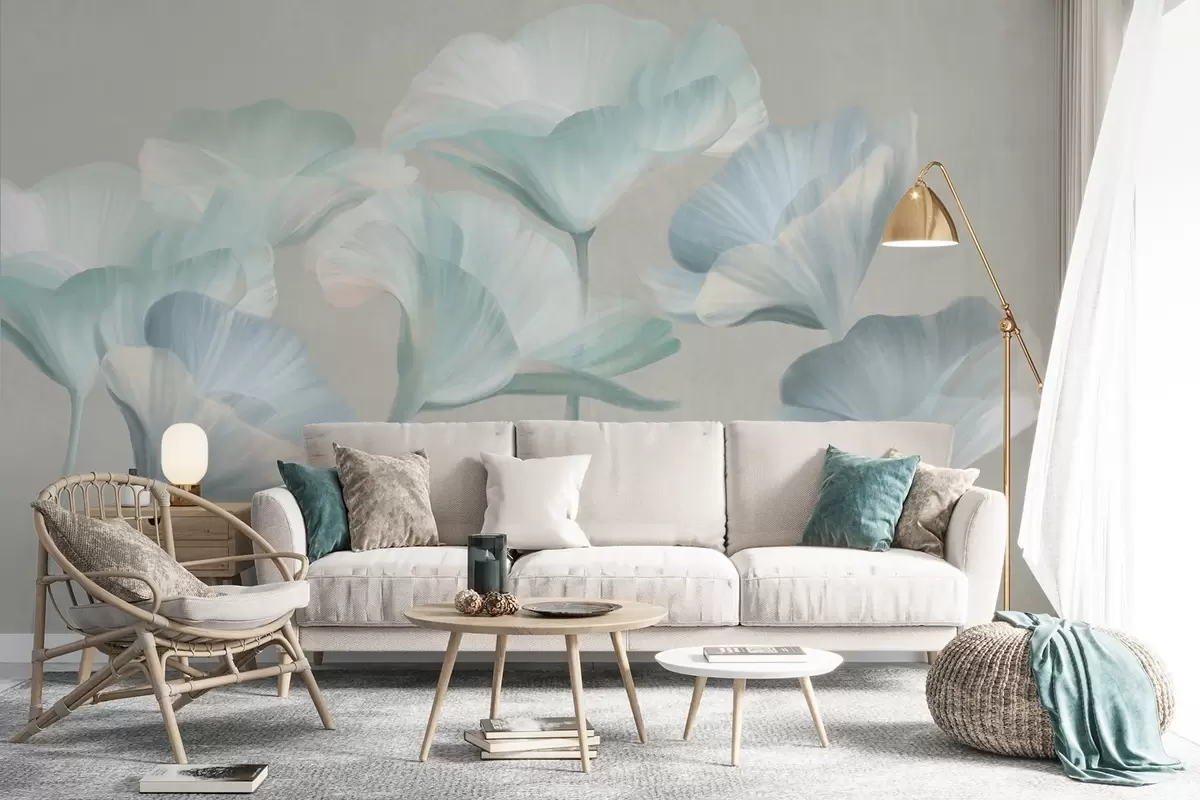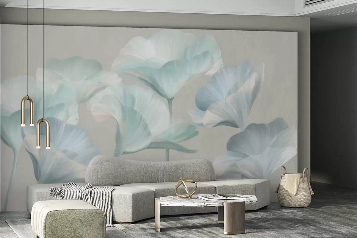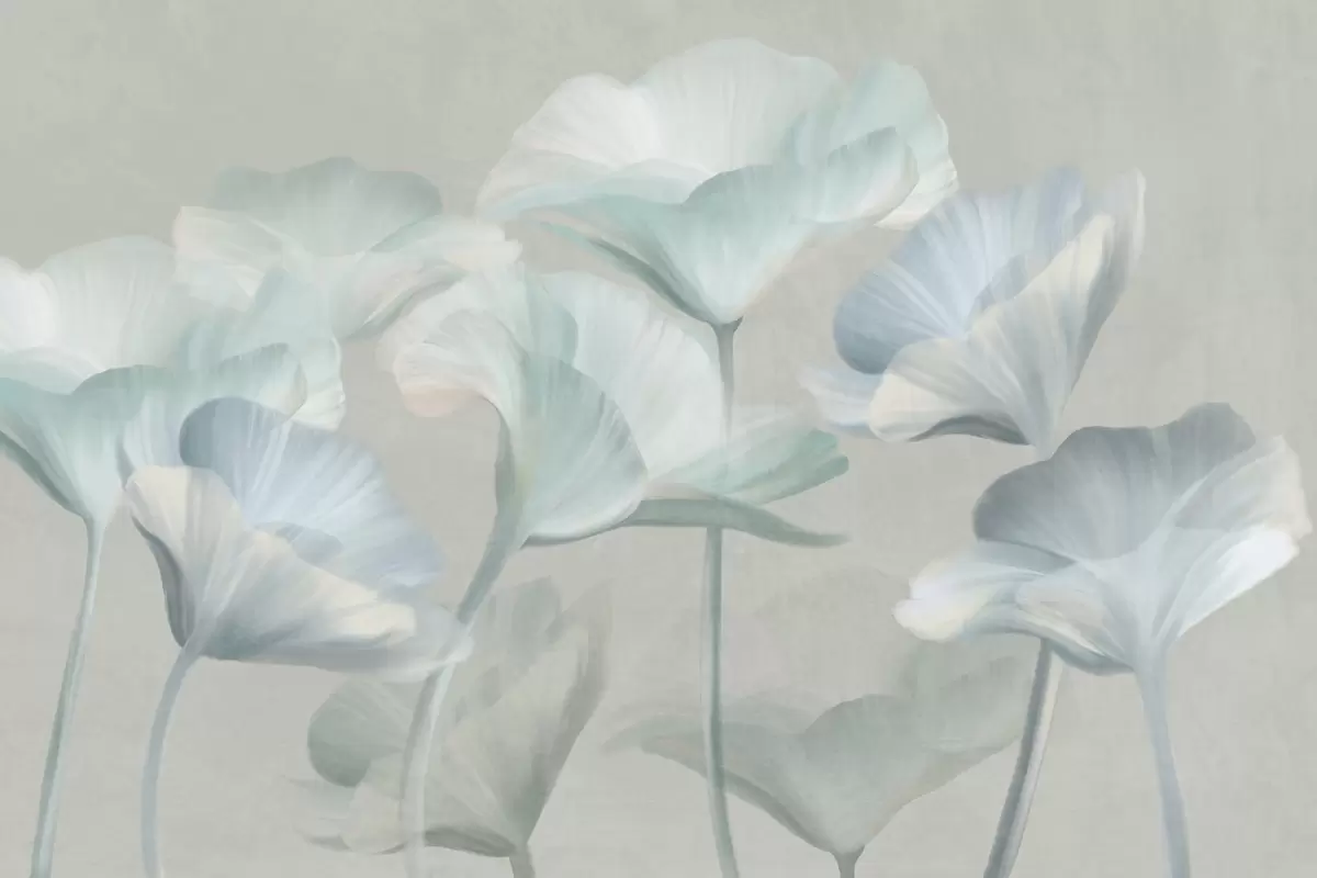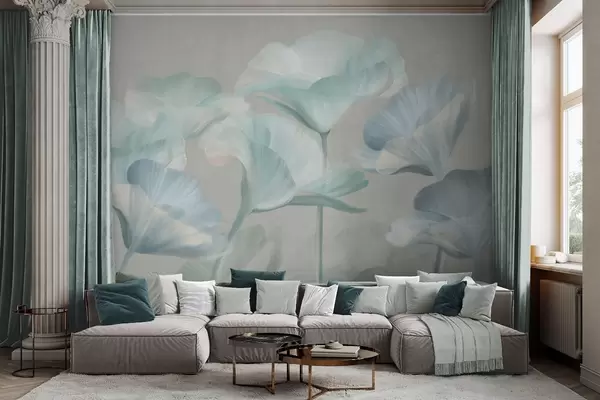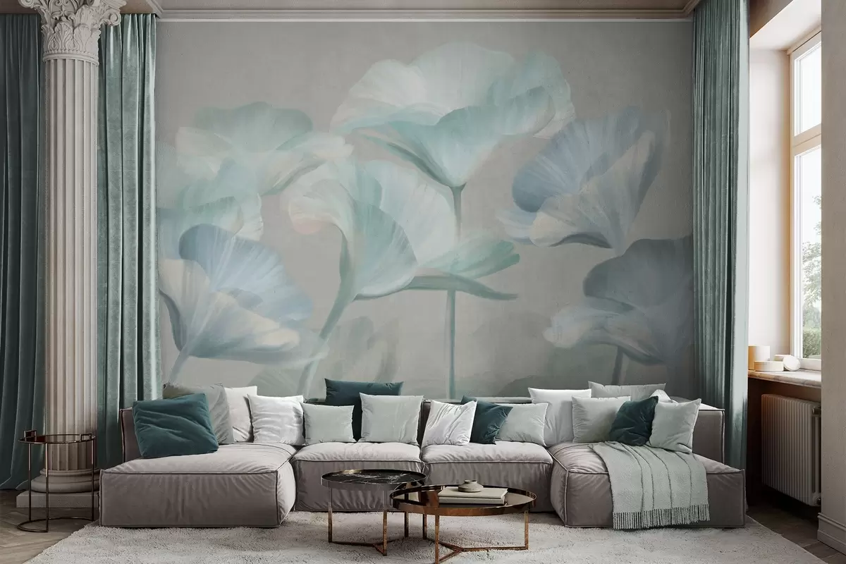 Fototapety Bledě tyrkysové průsvitné lotosové květy s jemnými okvětními lístky na tlumeném šedém pozadí Č. w09640v2