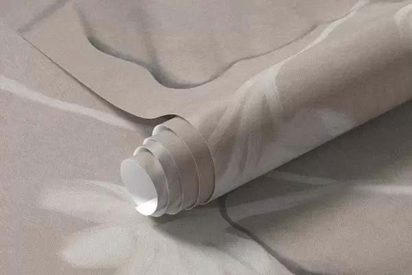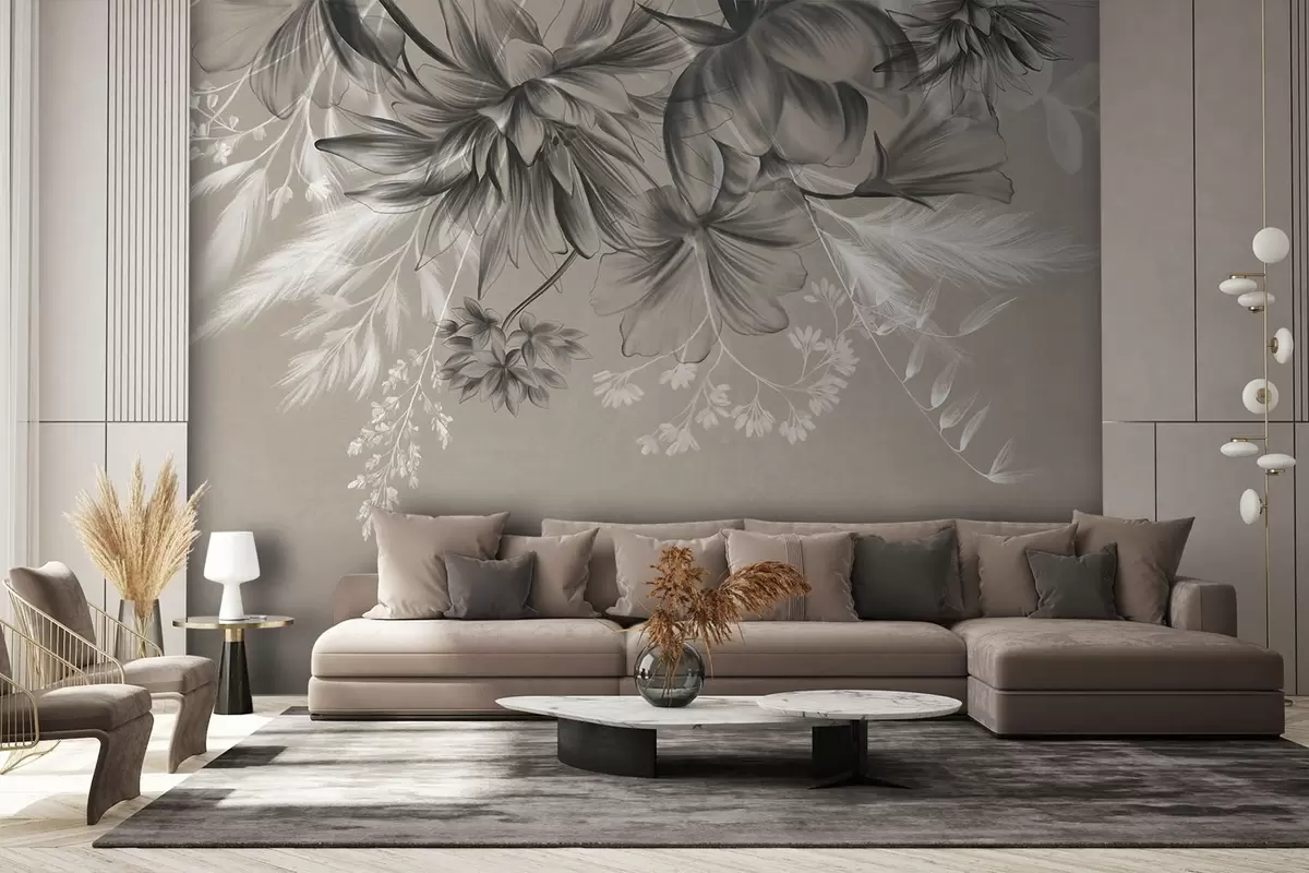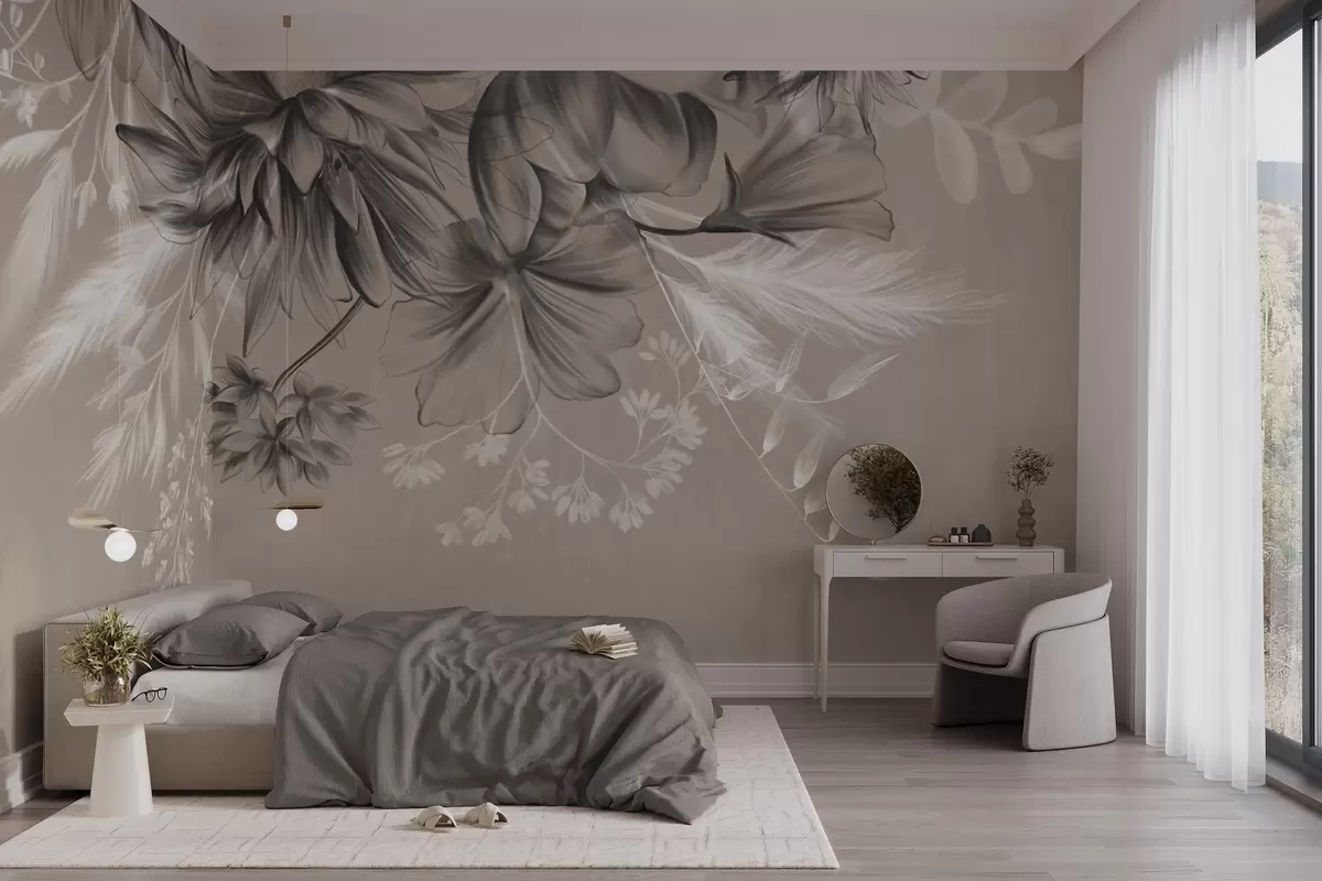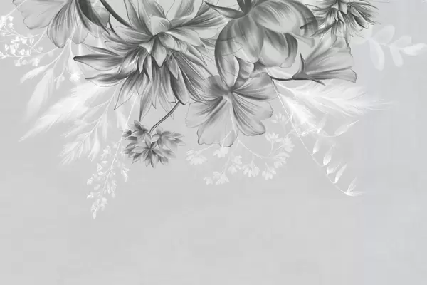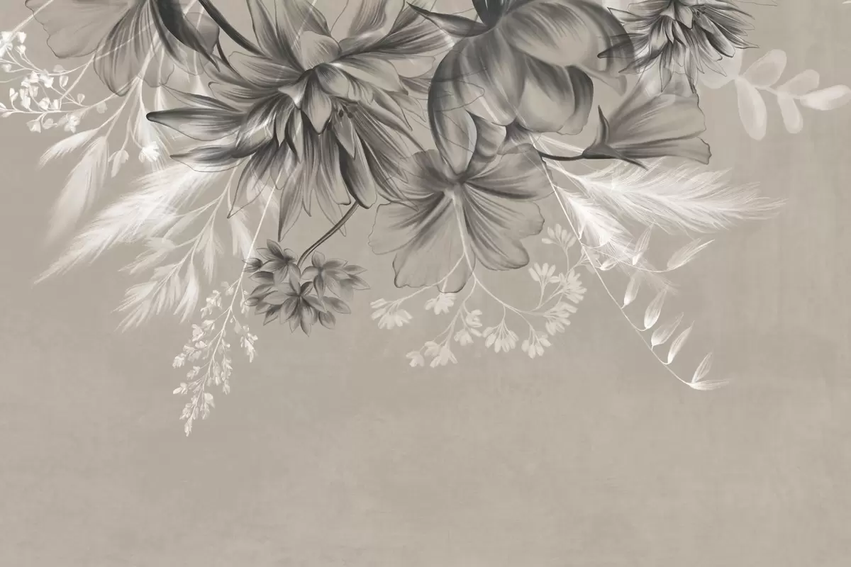 Fototapety Texturované květiny a kapradiny v odstínech tmavě šedé a bílé na tlumeném béžovém pozadí, kreslený styl Č. w09644