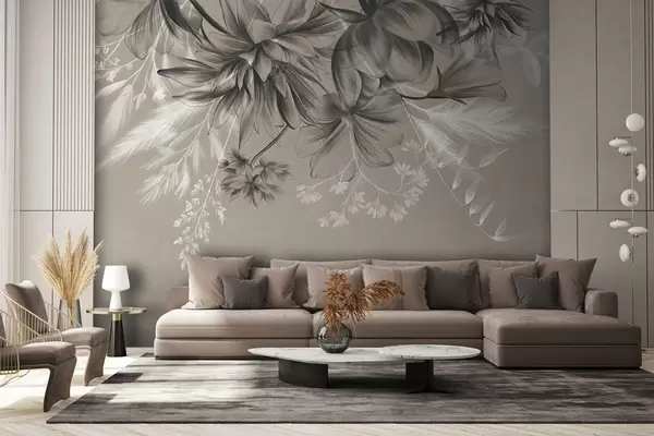 Fototapety Texturované květiny a kapradiny v odstínech tmavě šedé a bílé na tlumeném béžovém pozadí, kreslený styl Č. w09644
