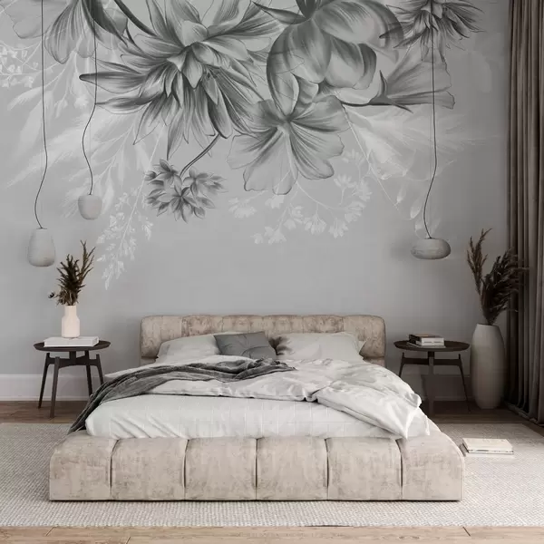 Fototapety Texturované květiny a kapradiny v odstínech tmavě šedé a bílé na tlumeném šedém pozadí, kreslený styl Č. w09644v1