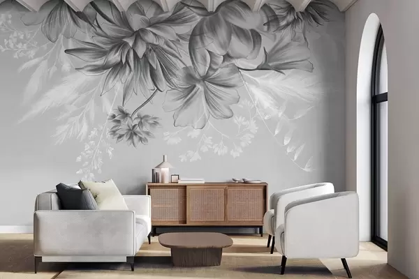 Fototapety Texturované květiny a kapradiny v odstínech tmavě šedé a bílé na tlumeném šedém pozadí, kreslený styl Č. w09644v1