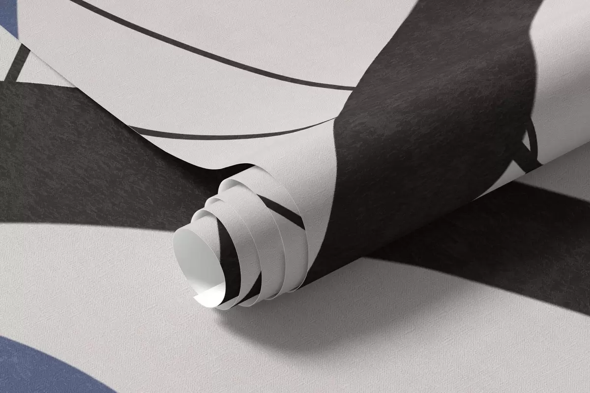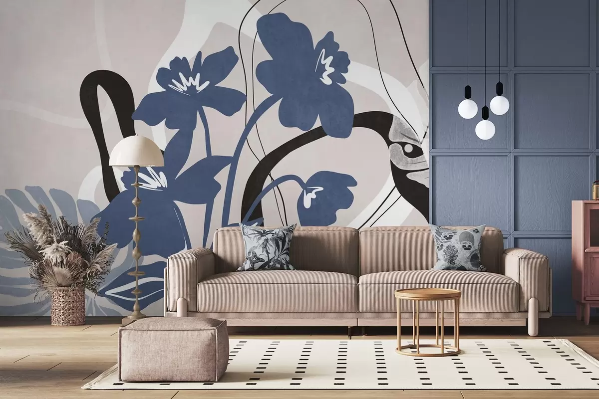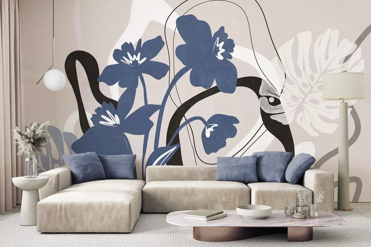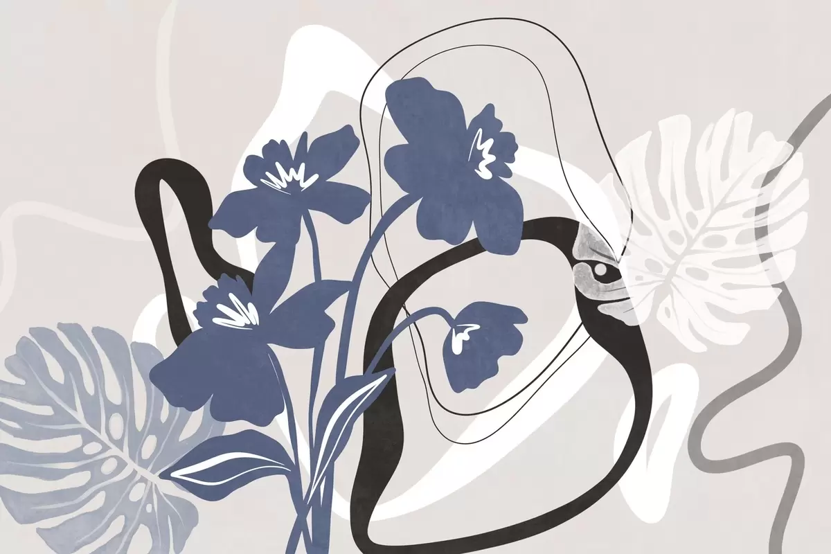 Fototapety Abstraktní texturované modré květy s bílými a černými tvary na světle béžovém pozadí, minimalistické umění Č. w09645