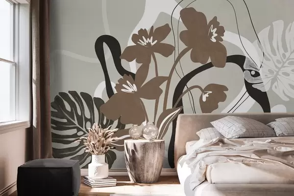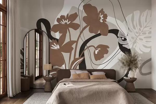 Fototapety Abstraktní texturované hnědé květy s bílými a černými tvary na béžovém pozadí, minimalistické umění Č. w09645v1
