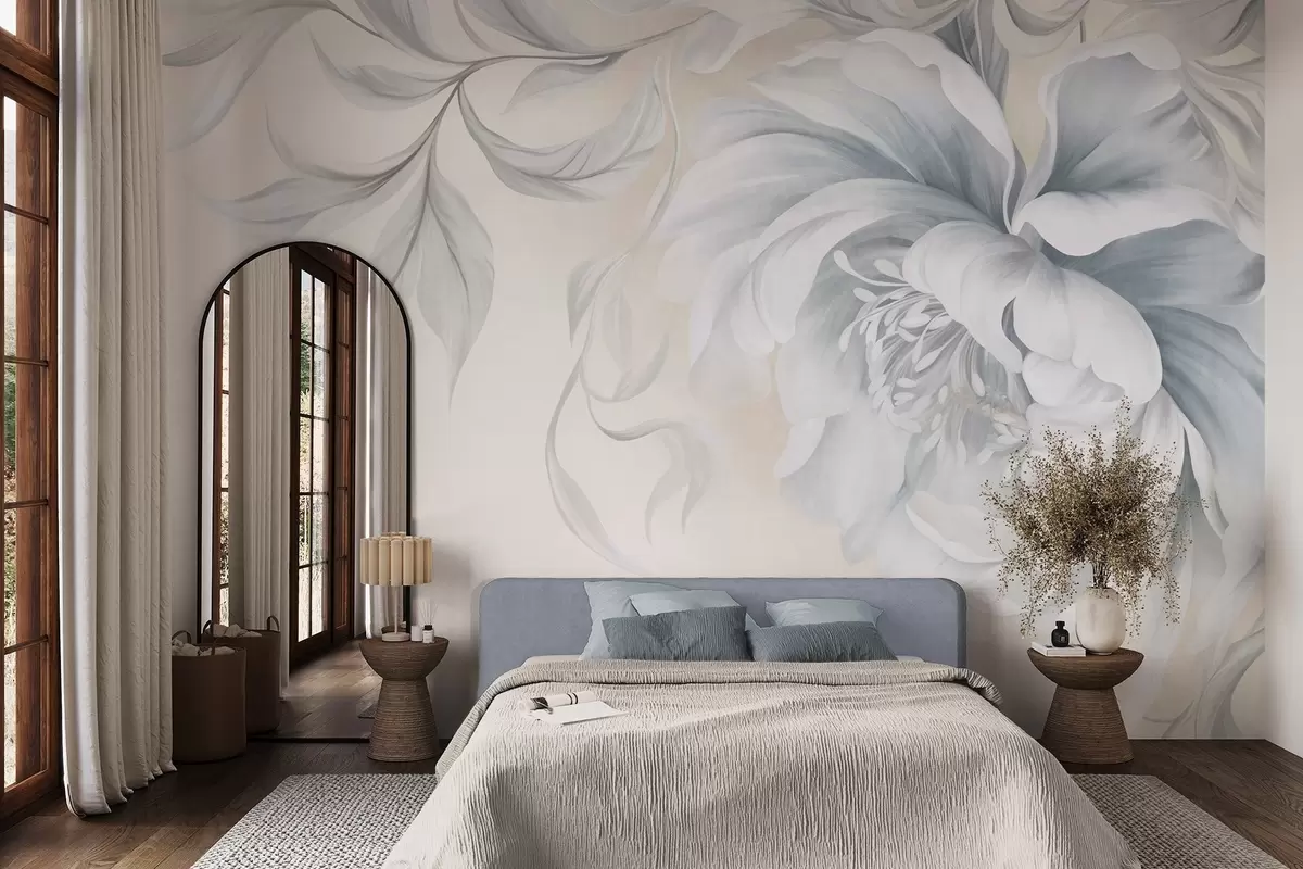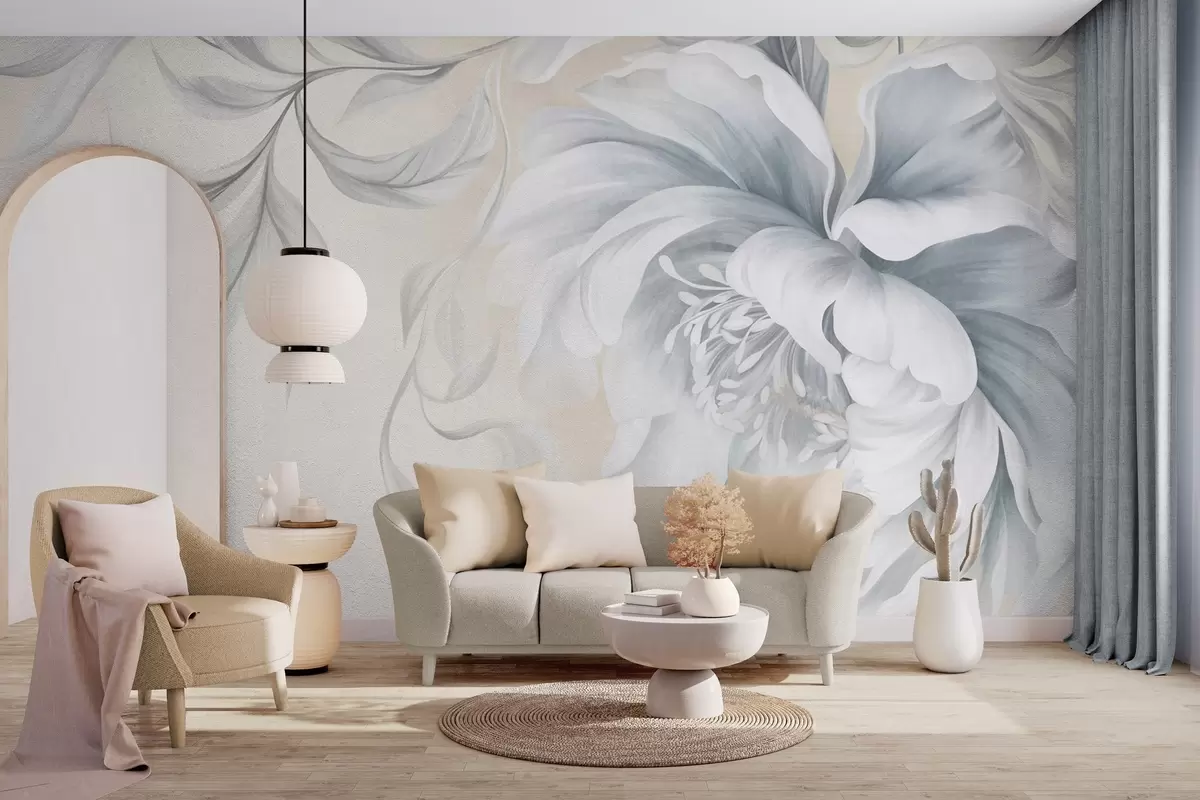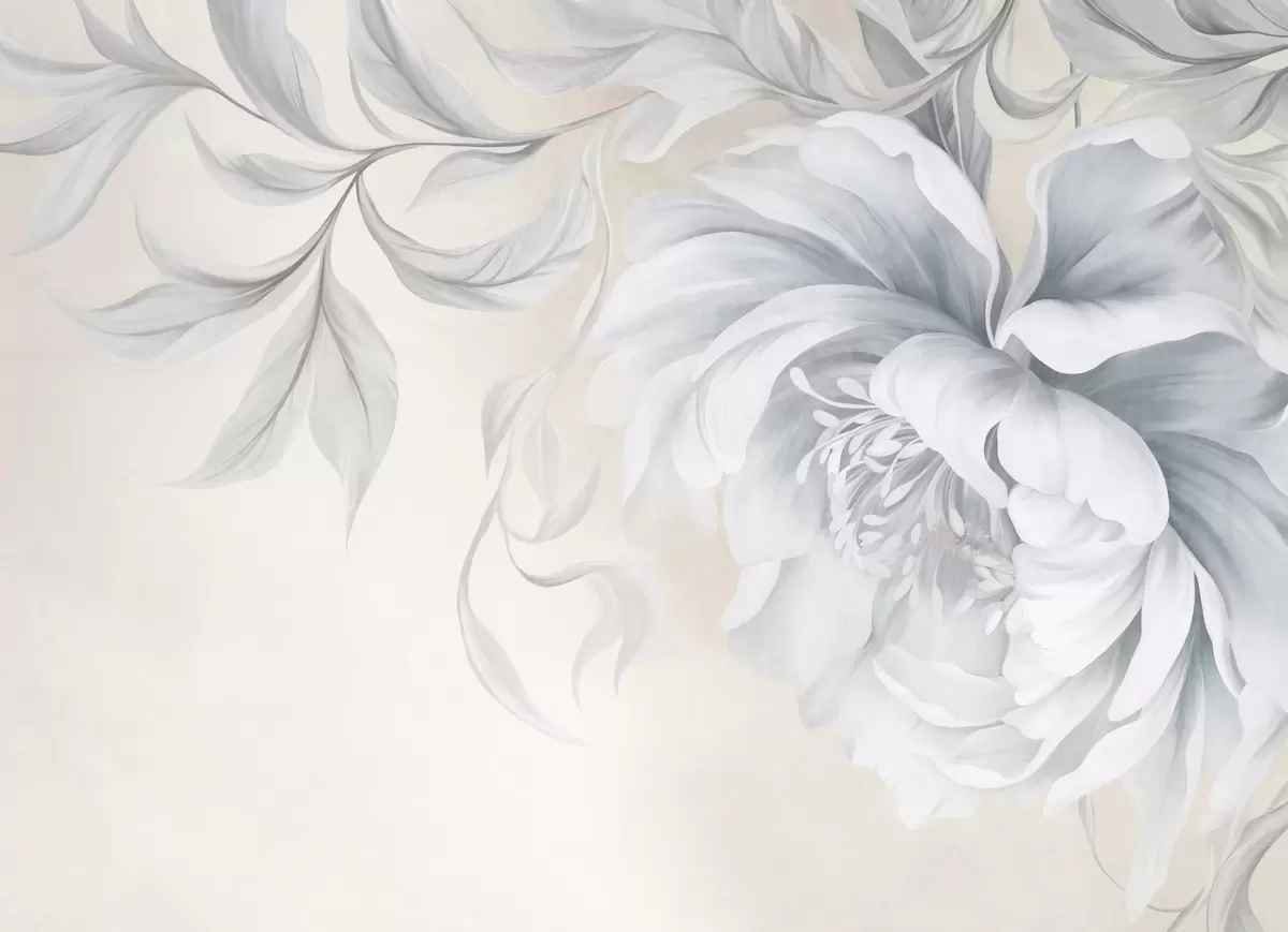 Fototapety Velká pivoňka s výraznou texturou, jemnými okvětními lístky a šedými listy, namalovaná v jemném stylu Č. w09647