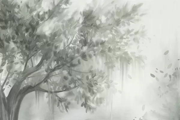 Fototapety Texturovaný strom se světle zelenými listy a větvemi, s jemným, zamlženým pozadím Č. w09650