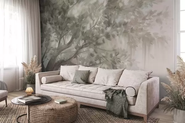 Fototapety Texturovaný strom se světle zelenými listy a větvemi, s jemným, zamlženým pozadím Č. w09650