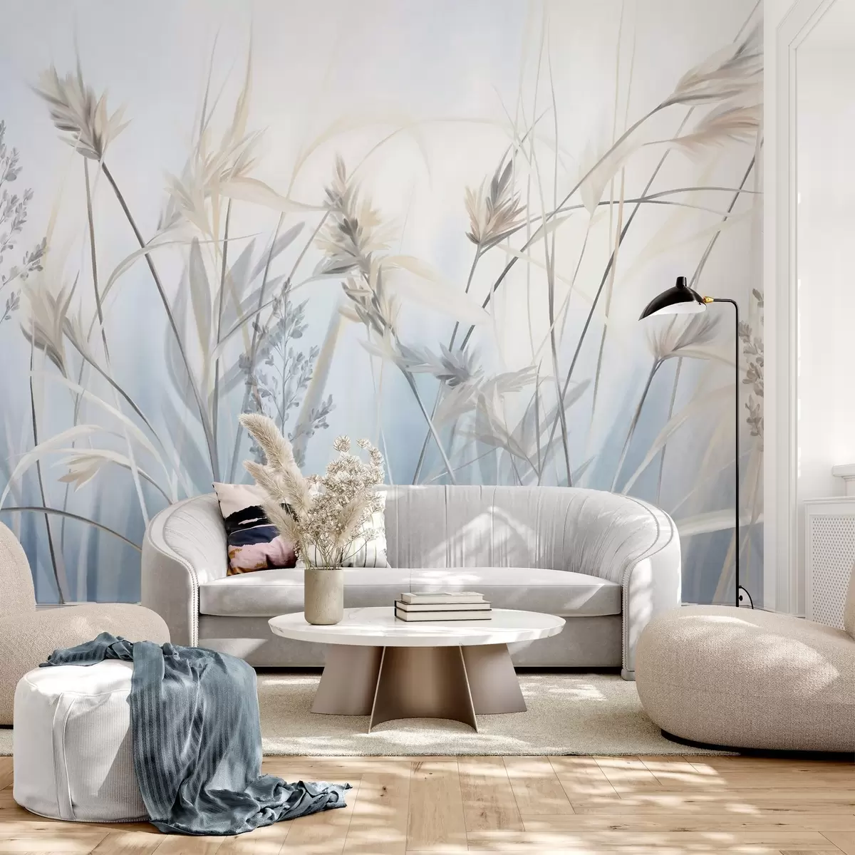 Fototapety Vysoké, suché stébla trávy s péřovitými vrcholy v tlumených tónech, měkké, zamlžené modré a bílé pozadí Č. w09652