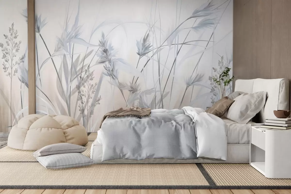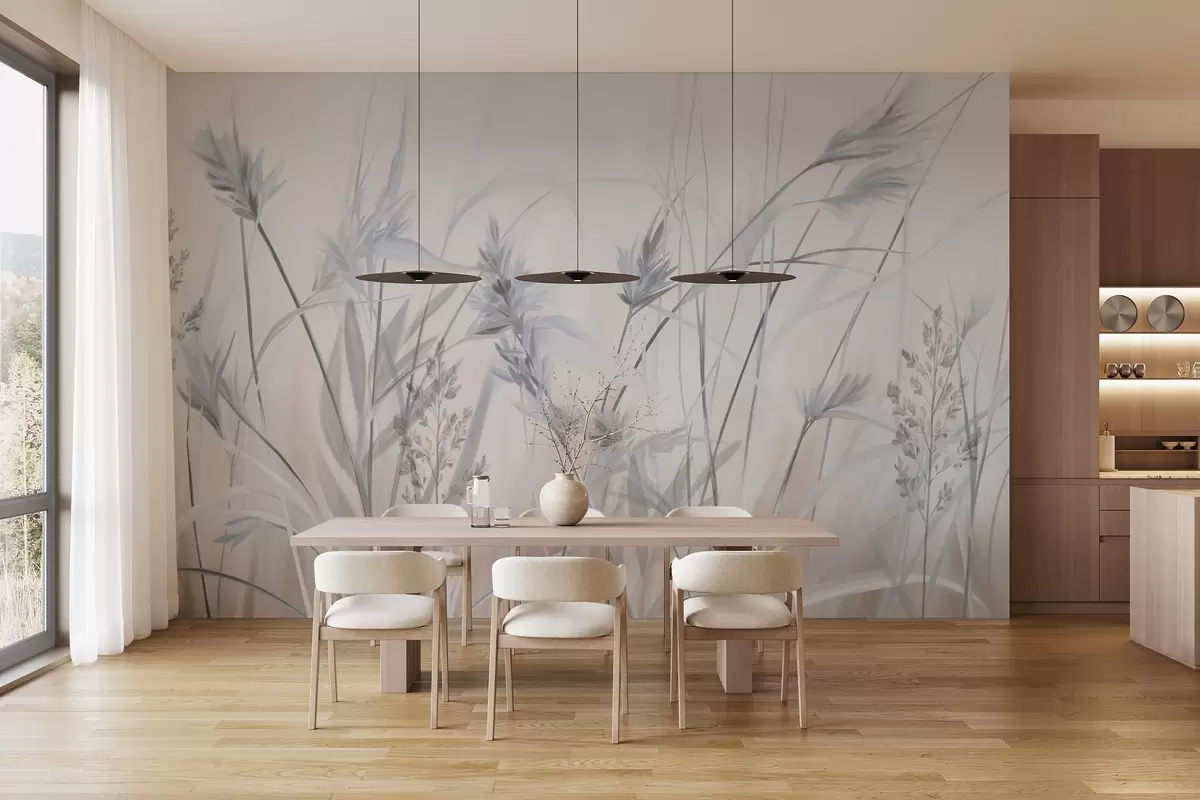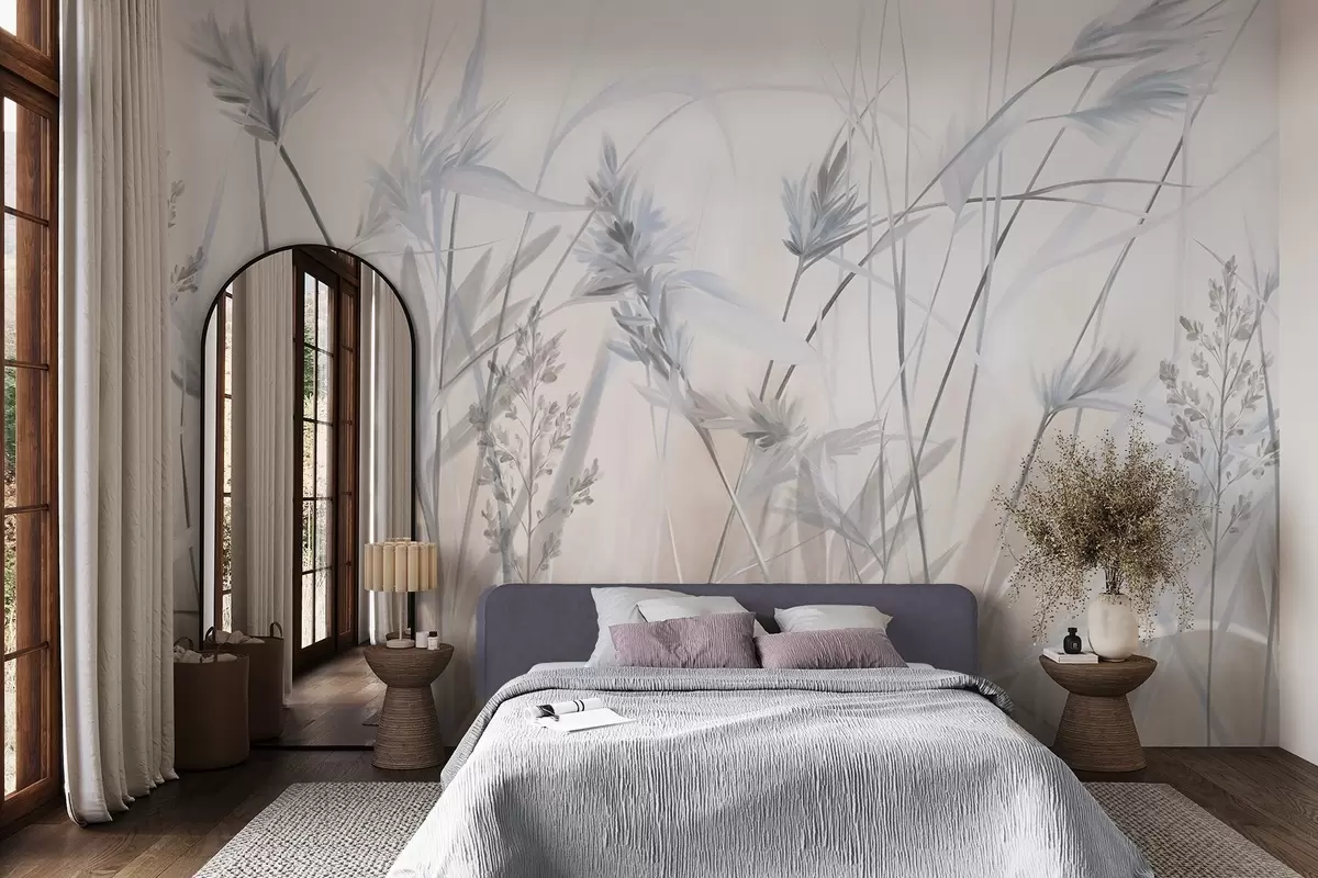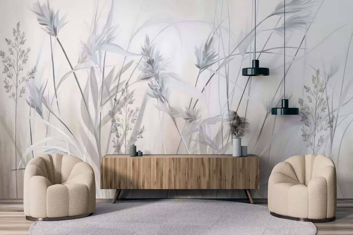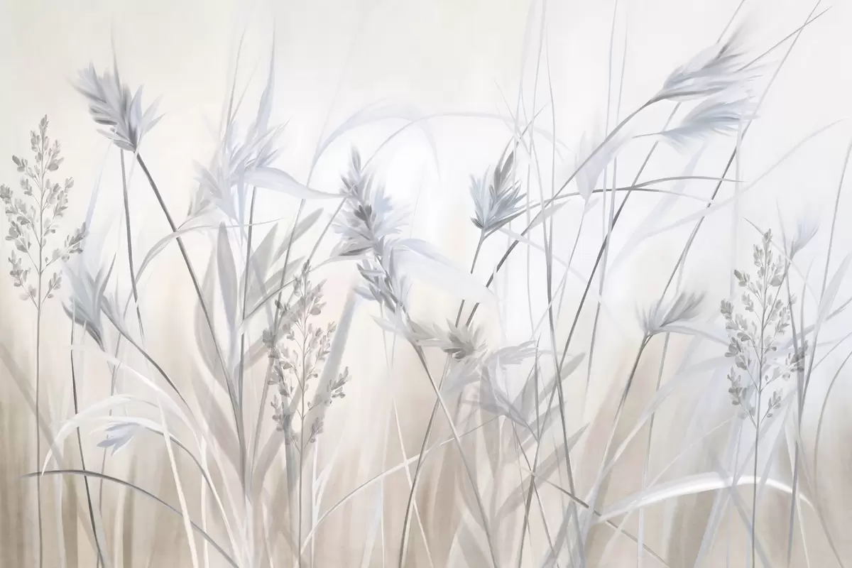 Fototapety Vysoké, suché stébla trávy s péřovitými vrcholy v tlumených tónech, měkké, zamlžené bílé a béžové pozadí Č. w09652v1
