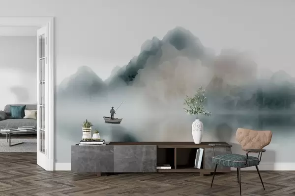 Fototapety Horská krajina s lodí a rybářem, která se ztrácí v jemné mlze Č. w09678