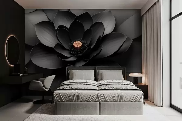 Fototapety Minimalistická černá květina s okvětními lístky a kontrastním teplým středem Č. w09721