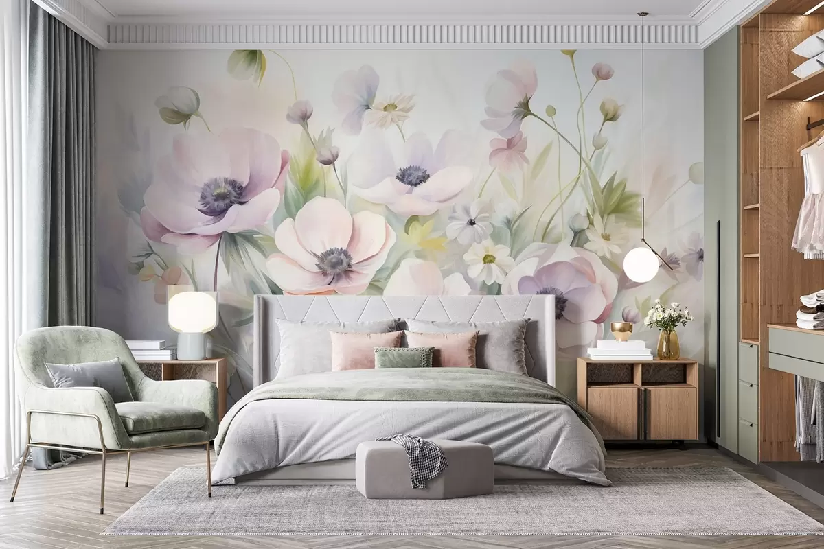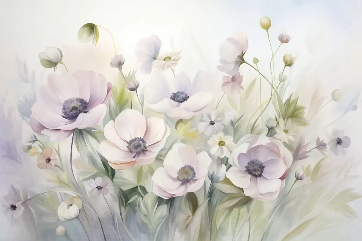 Fototapety Pole pastelově růžových a bílých květů sasanek, zelené listoví a malé bílé sedmikrásky Č. w09742
