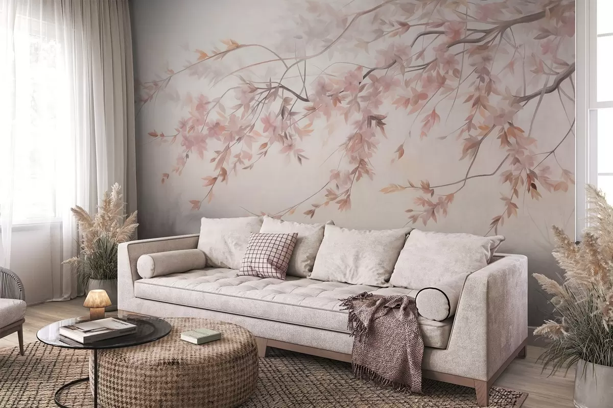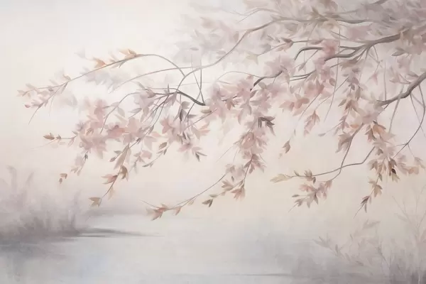 Fototapety Texturovaná krajina s větví třešňového květu, růžovými listy a jemným zamlženým pozadím Č. w09743