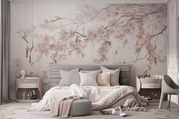 Fototapety Texturovaná krajina s větví třešňového květu, růžovými listy a jemným zamlženým pozadím Č. w09743