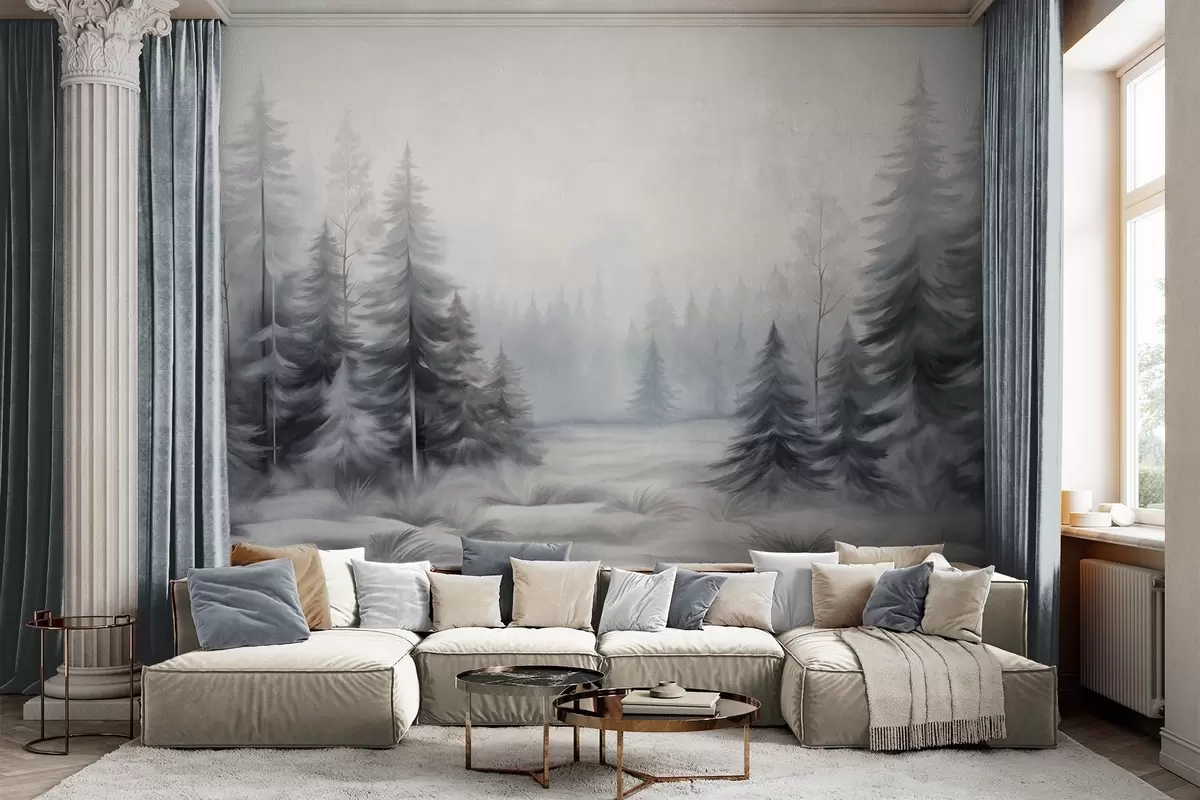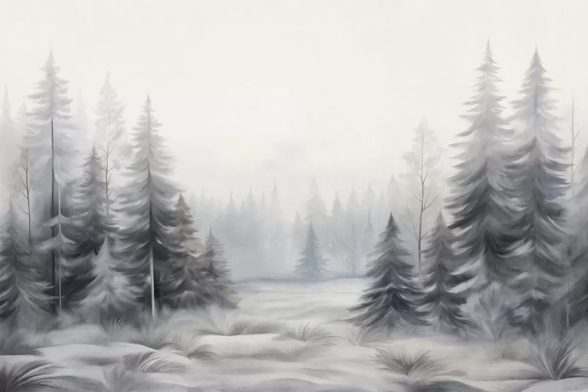 Fototapety Texturované zimní lesní stromy v mlze, v tlumených šedých a bílých tónech Č. w09745