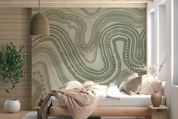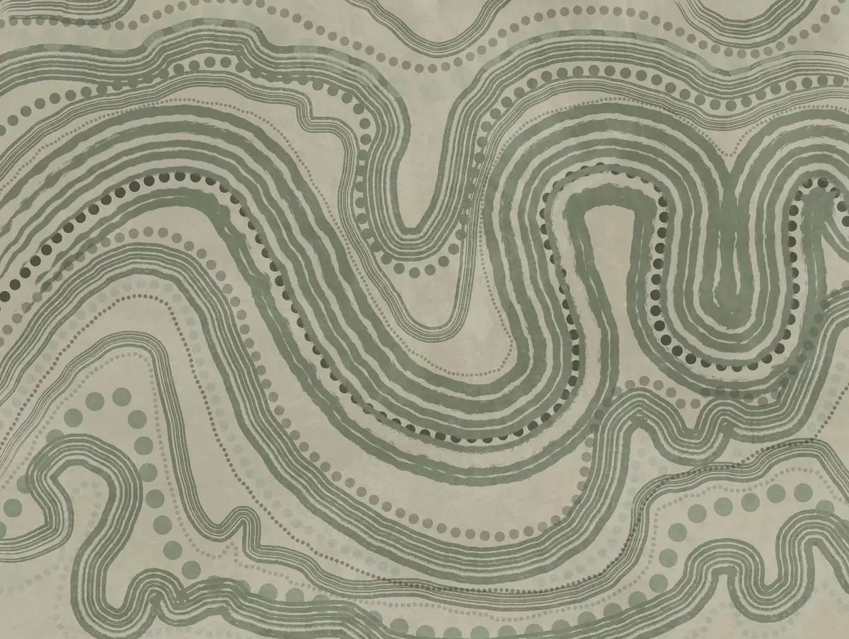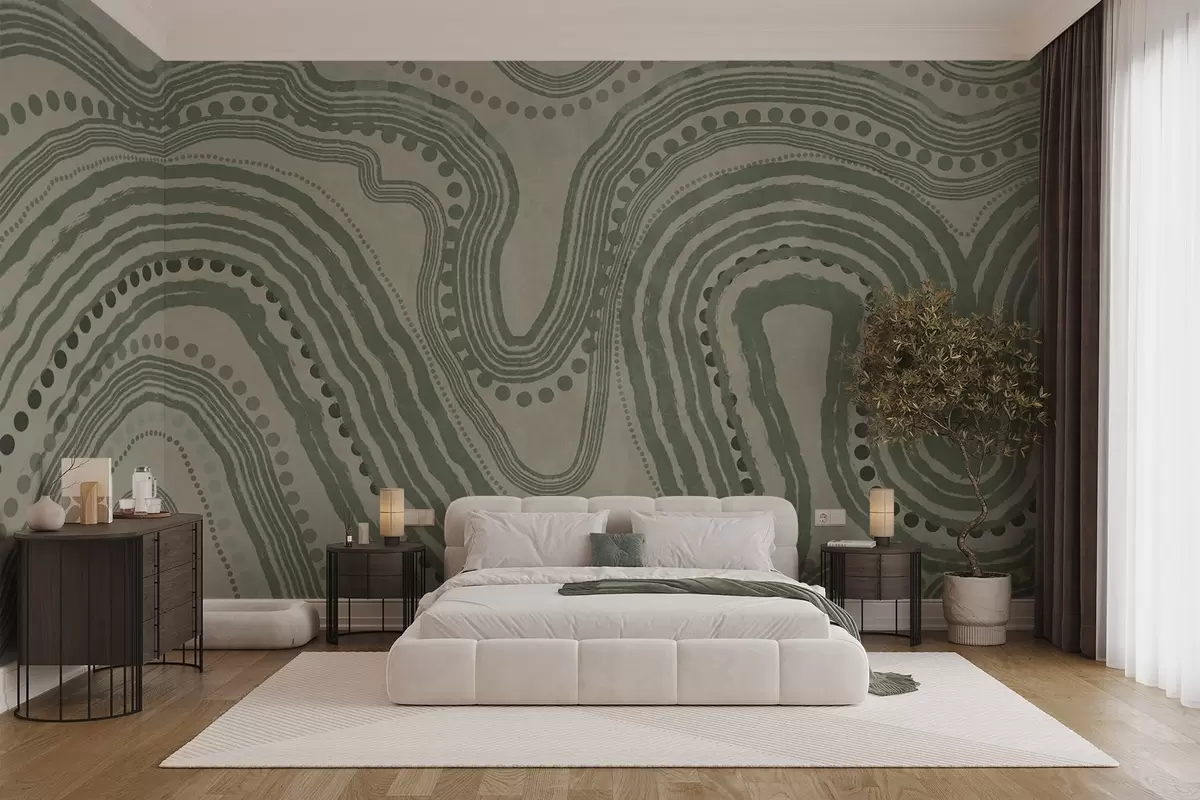 Fototapety Abstraktní zelené a béžové vlnovky a tečky, moderní texturované umění Č. w09747