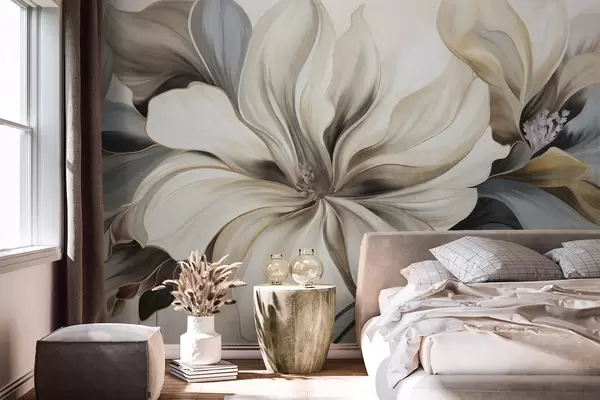 Fototapety Velké, krémové květy magnólie s hnědými a šedými listy, měkké osvětlení, abstraktní pozadí Č. w09749