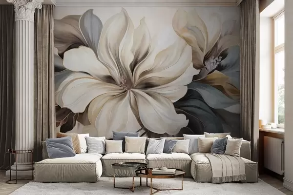 Fototapety Velké, krémové květy magnólie s hnědými a šedými listy, měkké osvětlení, abstraktní pozadí Č. w09749