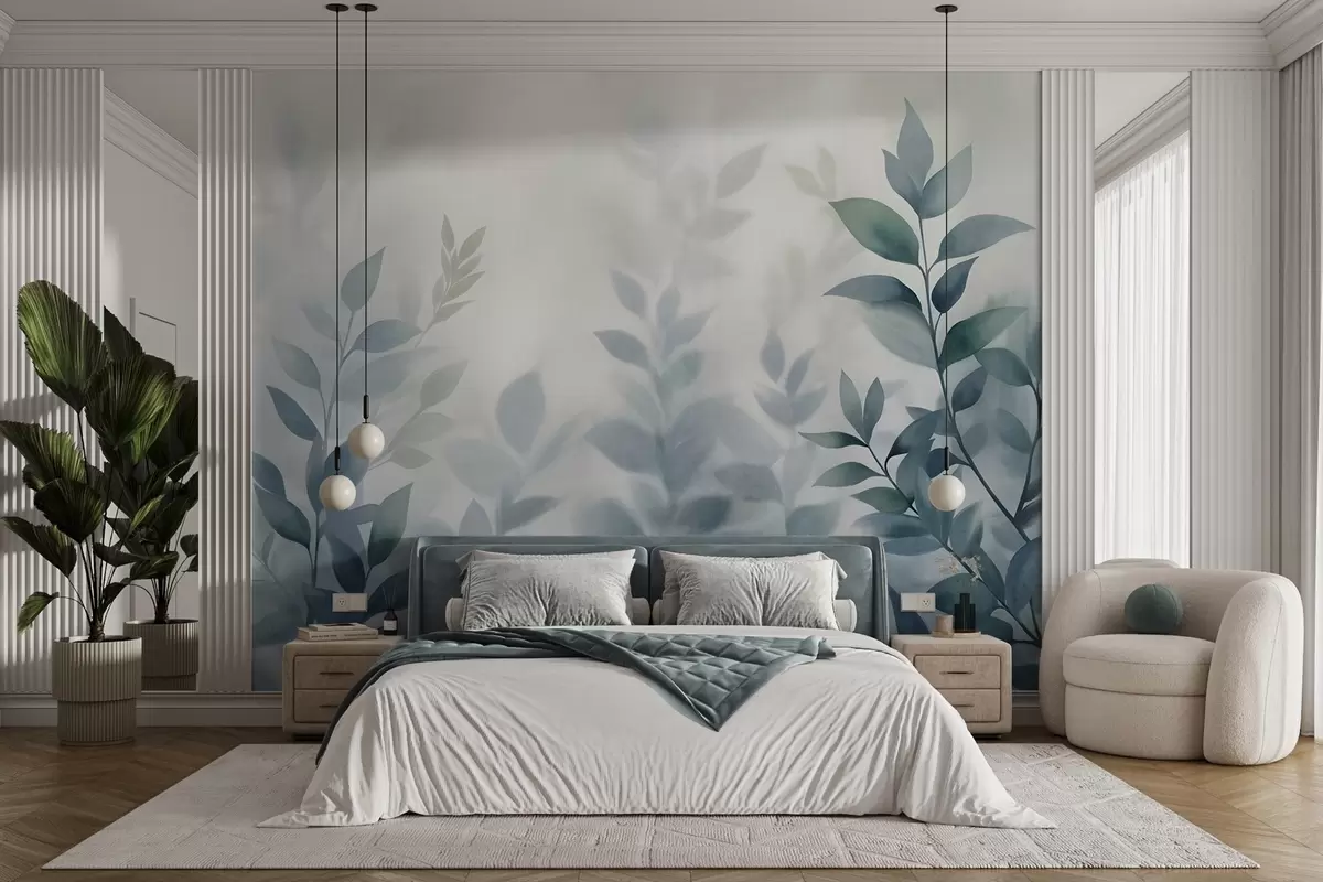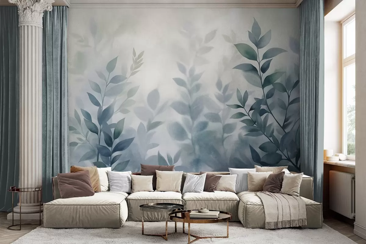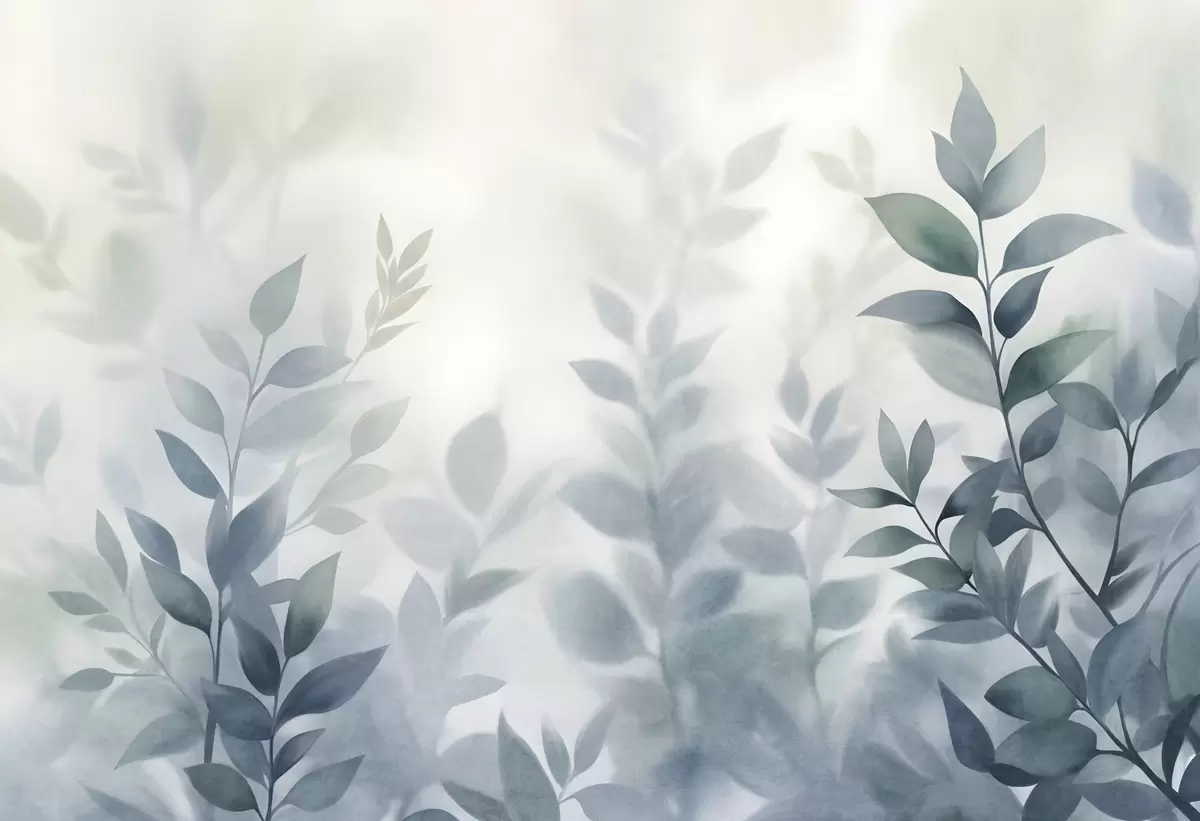 Fototapety Jemné větve s tlumeně modrými listy, akvarelový styl malby, texturované umění Č. w09750v1