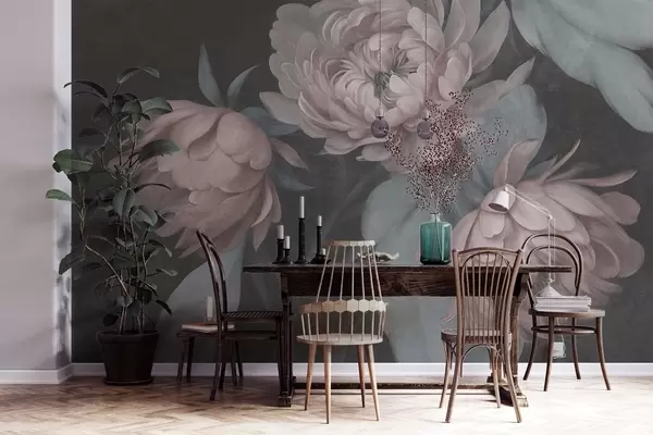 Fototapety Texturované světle růžové květy pivoňky s tlumeně zelenými listy na tmavém pozadí Č. w09751v1