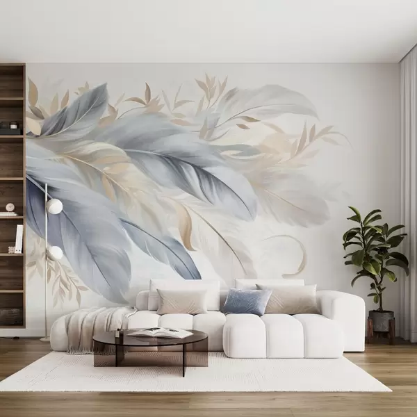Fototapet Strukturovaná pastelově zbarvená peříčka a jemné lístky na světlém pozadí w09763