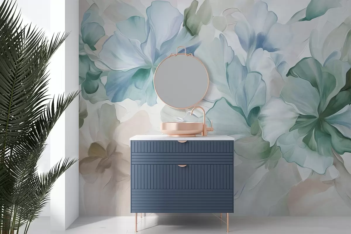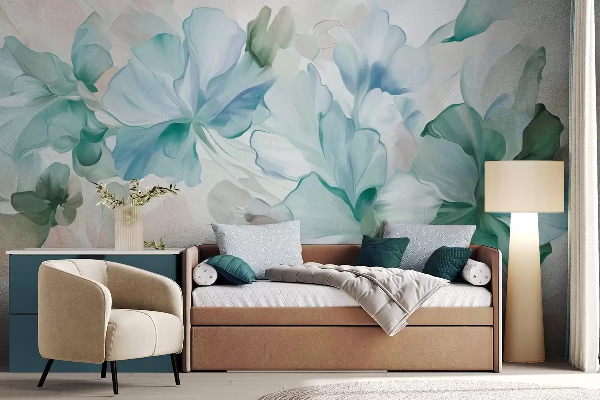 Fototapety Abstraktní fantazijní květiny v odstínech zelené, modré a béžové, v malířském stylu, texturované umění Č. w09767v1