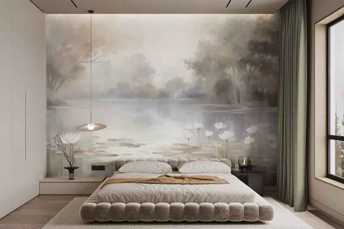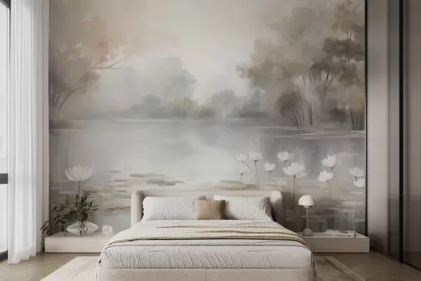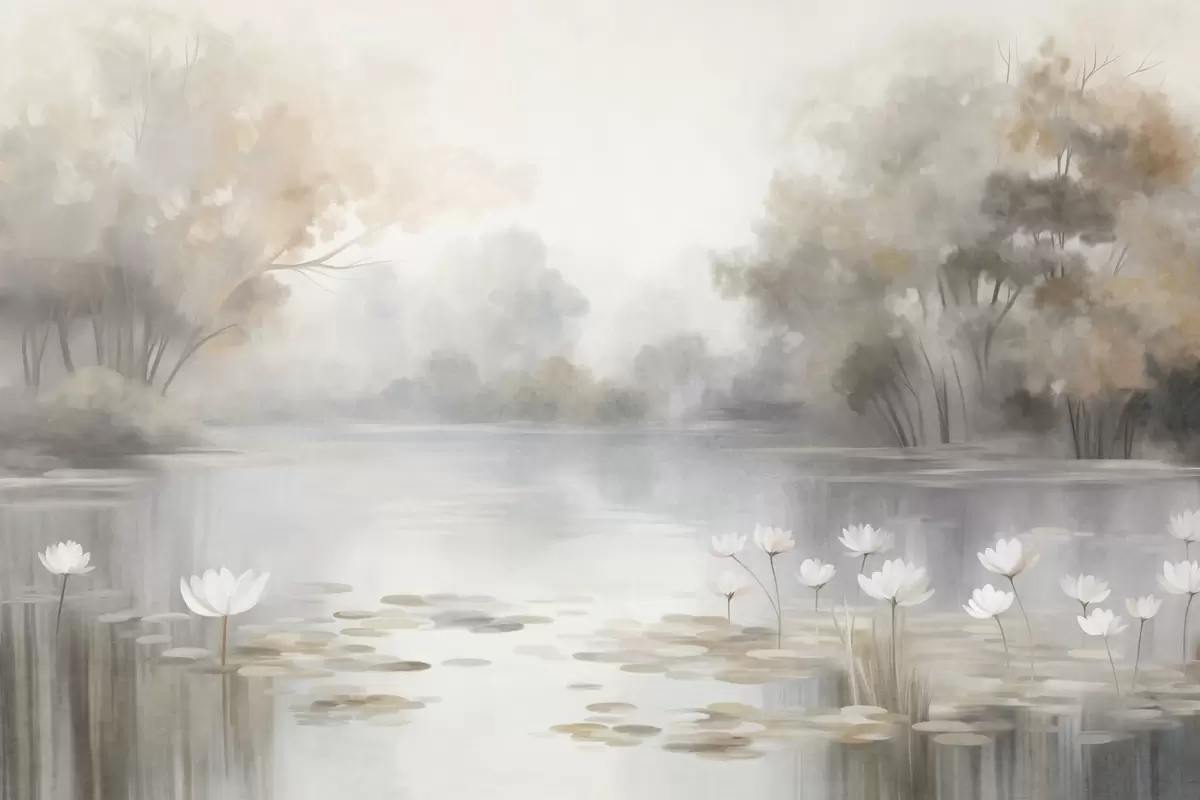 Fototapety Krajina s rozmanitým reliéfem, jezero s bílými lekníny, obklopené stromy v tlumených barvách Č. w09768