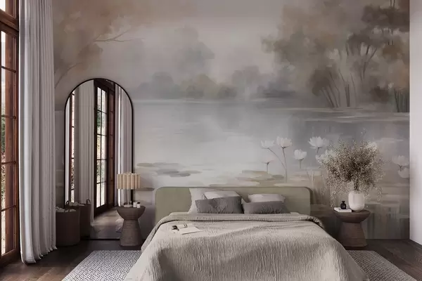 Fototapety Krajina s rozmanitým reliéfem, jezero s bílými lekníny, obklopené stromy v tlumených barvách Č. w09768