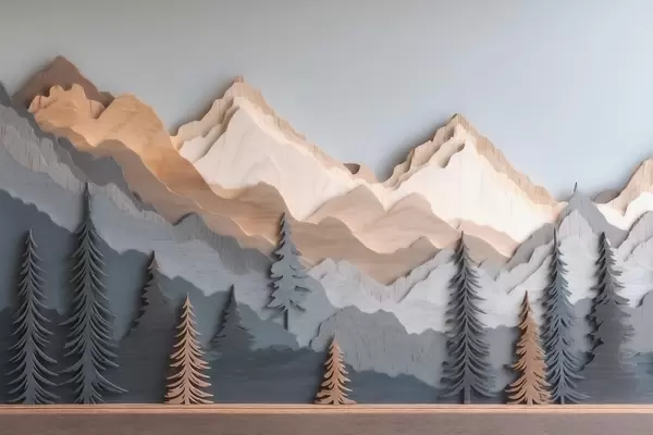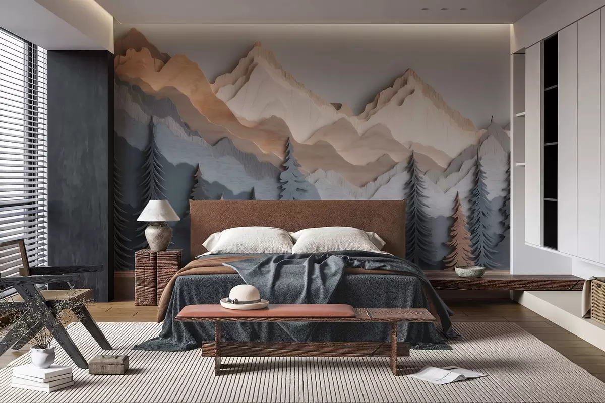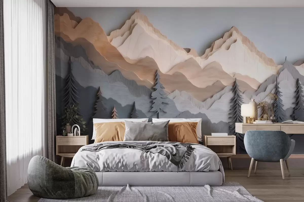 Fototapety Přírodní krajina s borovicemi a horami ve stylu řezbářské práce Č. w09793
