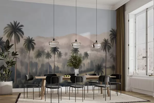 Fototapety Tropická krajina s palmami a horami, retro panorama v béžových a zelených tónech Č. w09798