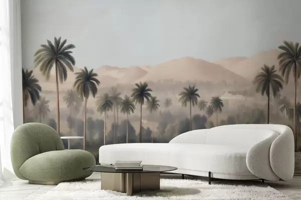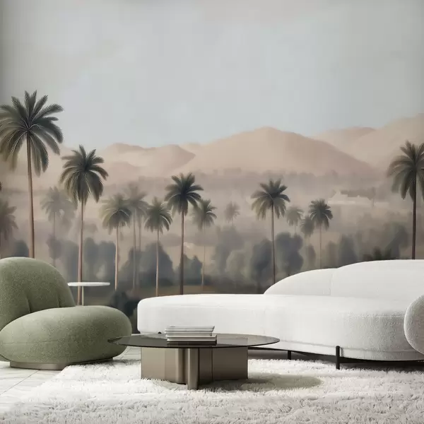 Fototapety Tropická krajina s palmami a horami, retro panorama v béžových a zelených tónech Č. w09798