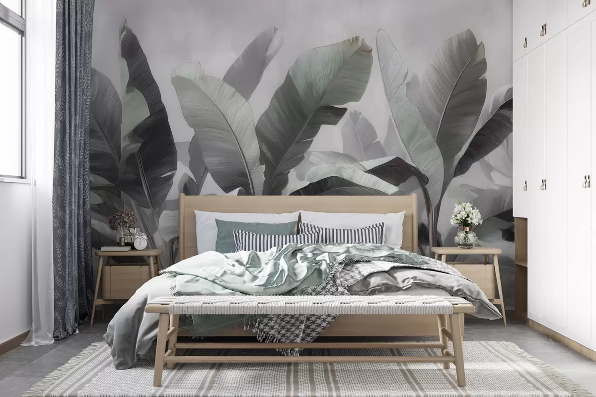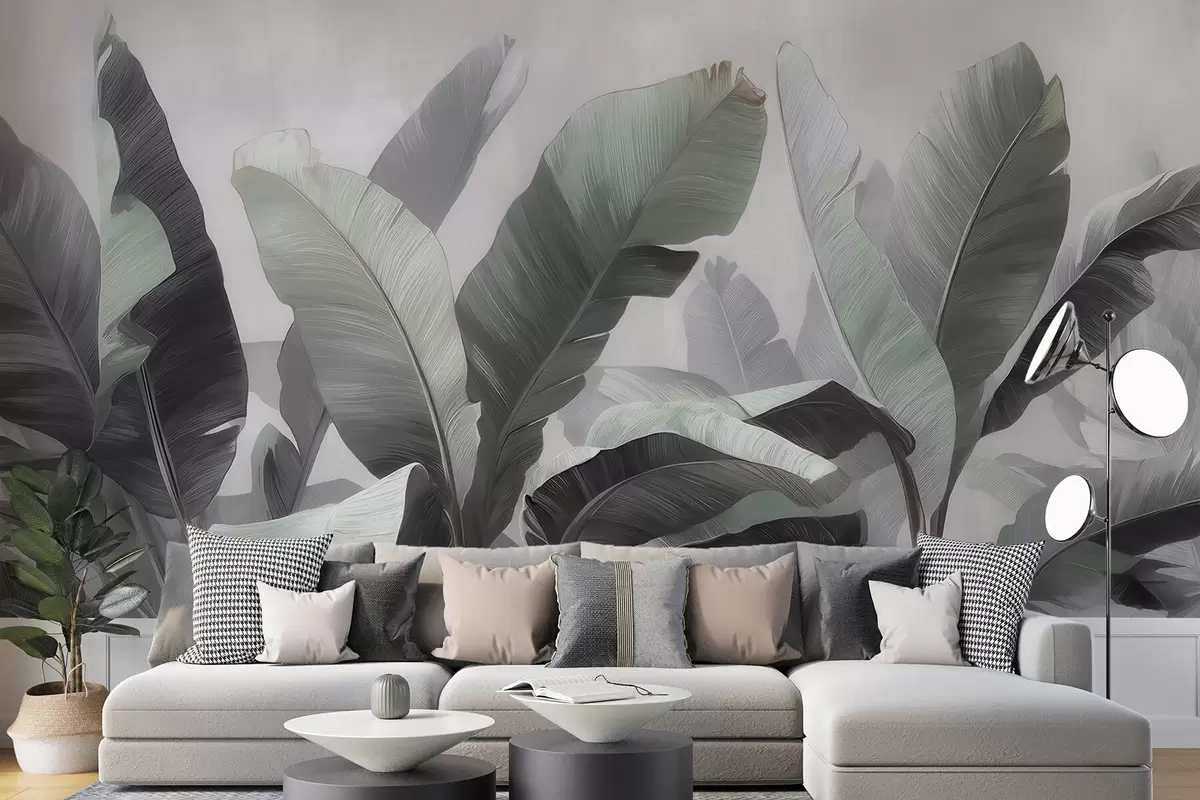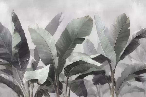 Fototapety Abstraktní motiv velkých tropických banánových listů v neutrální barevné škále s jemnými šedozelenými tóny Č. w09805