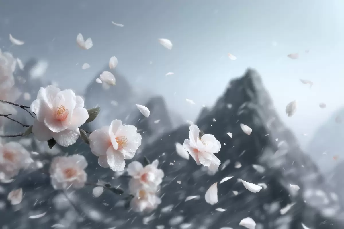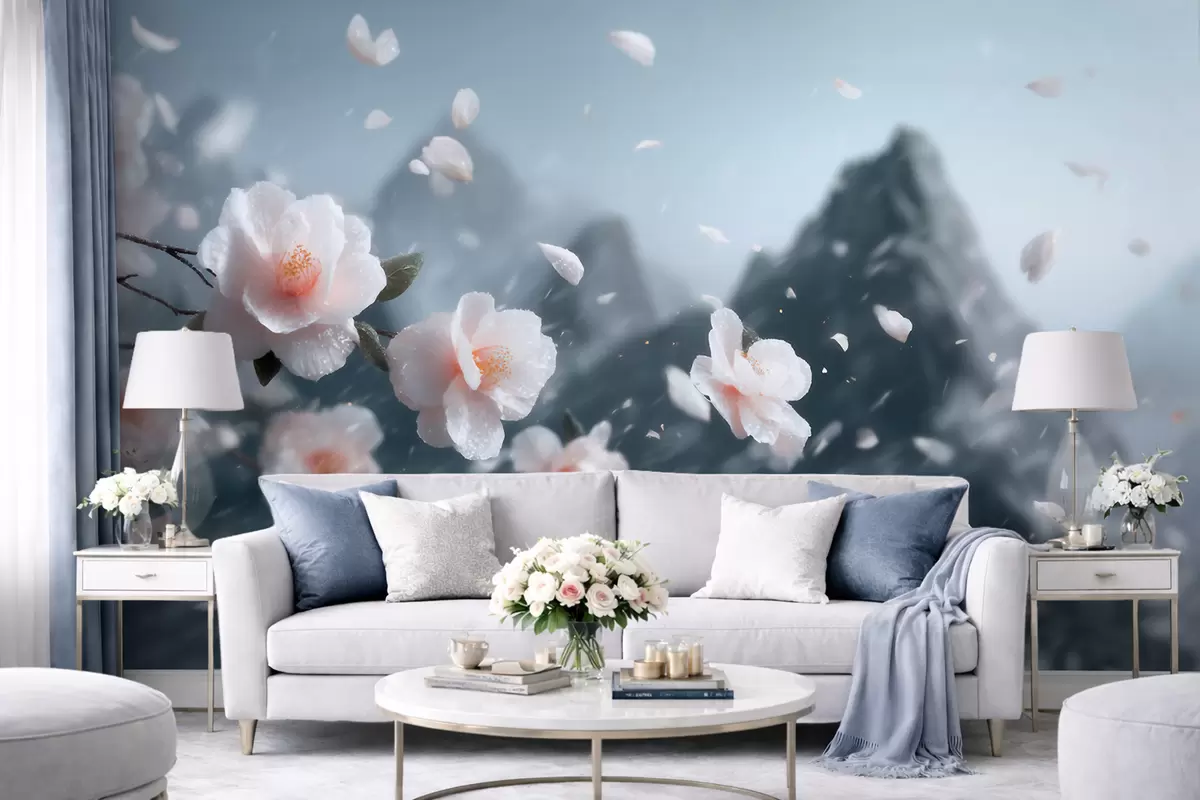 Fototapety Jemné květy třešňových stromů na pozadí hor, atmosférická japonská krajina v pastelových tónech Č. w09808
