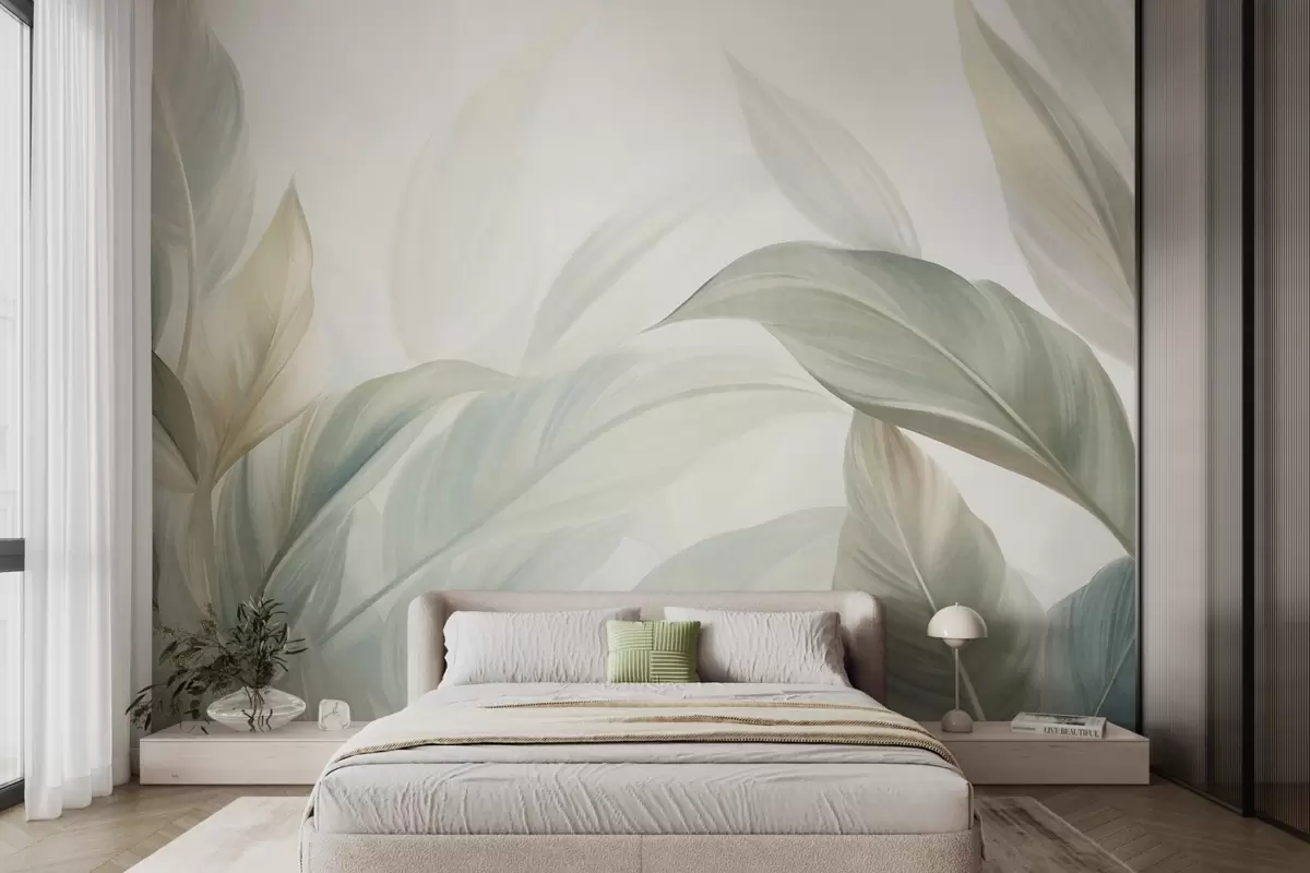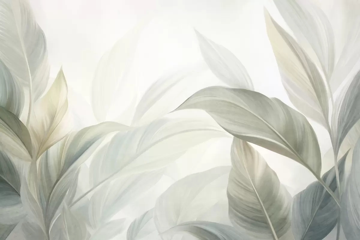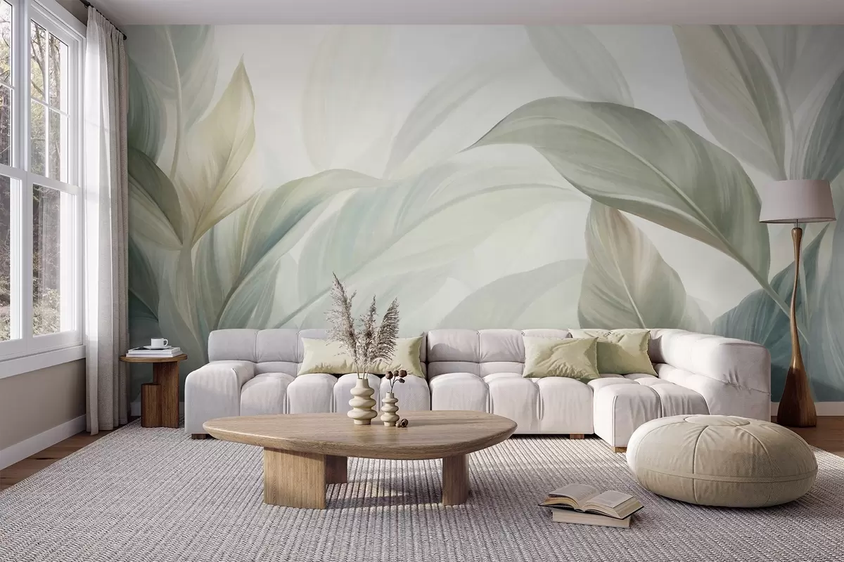 Fototapety Velké, světle zelené tropické listy v jemných pastelových barvách, texturované umělecké dílo Č. w09816