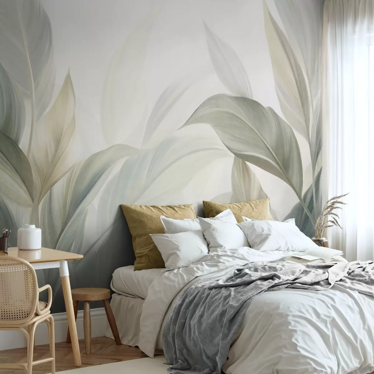 Fototapety Velké, světle zelené tropické listy v jemných pastelových barvách, texturované umělecké dílo Č. w09816