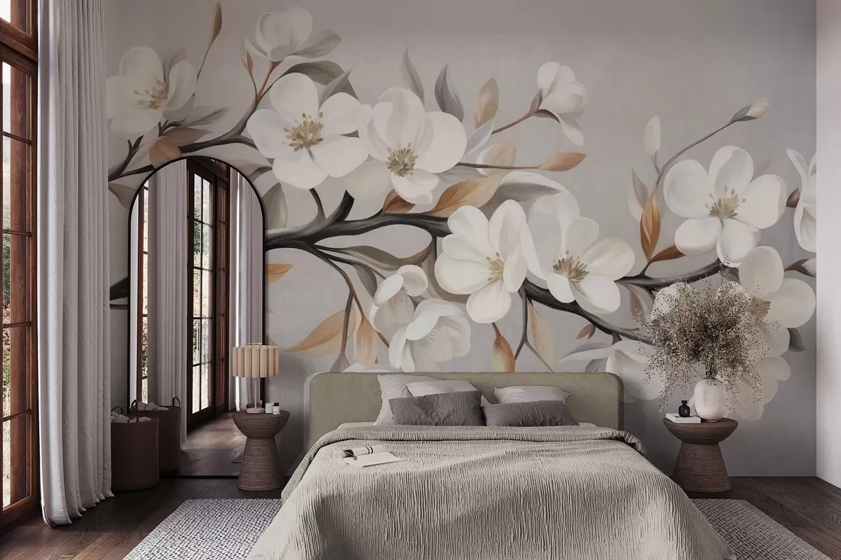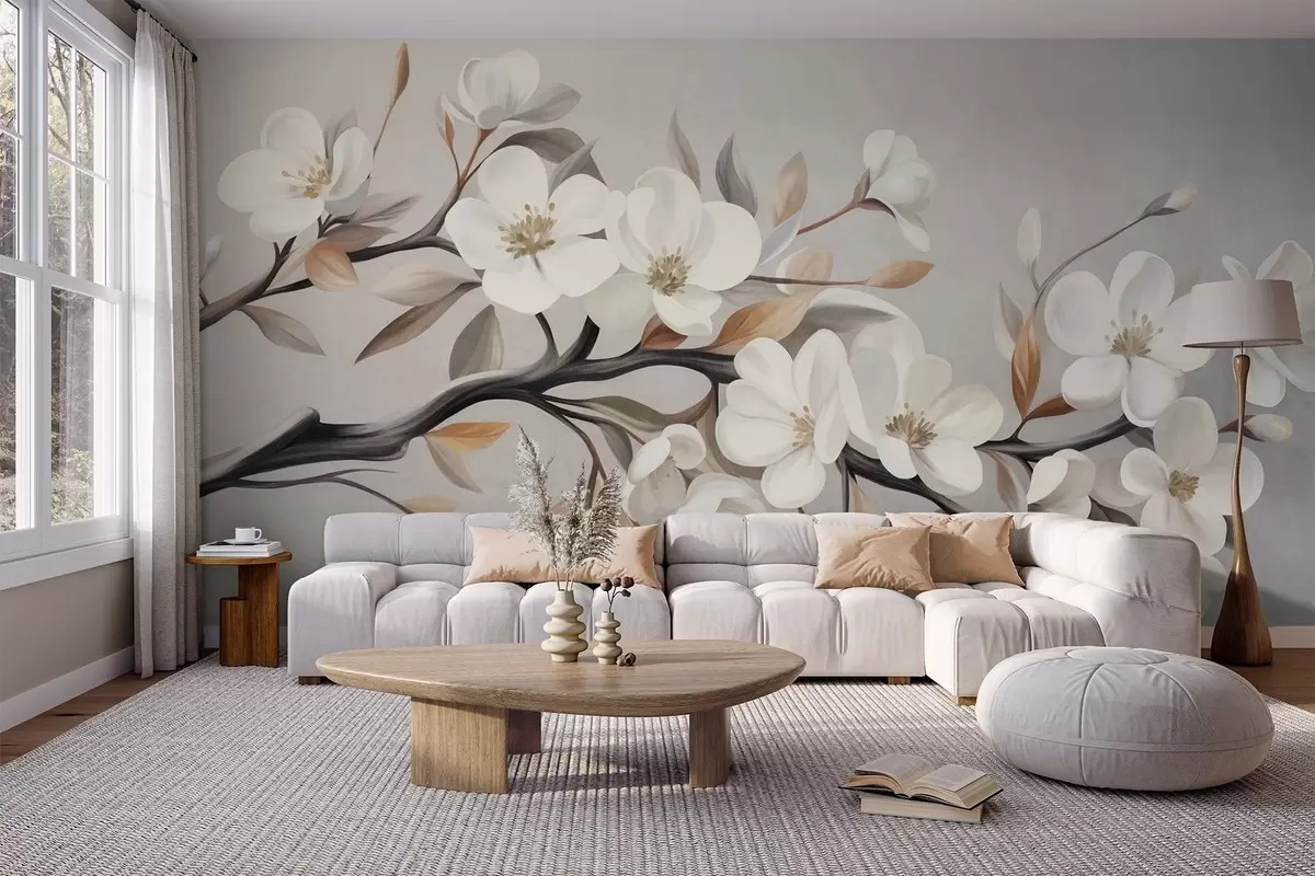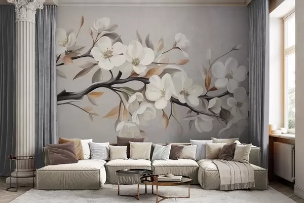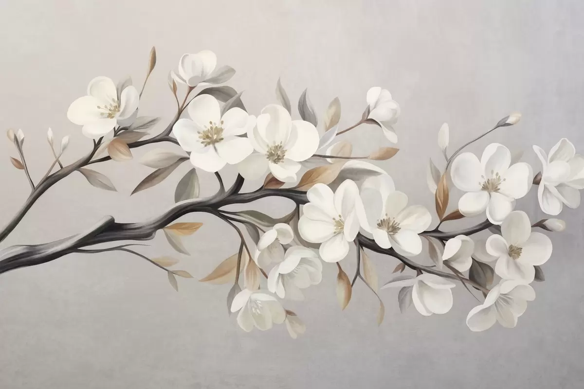 Fototapety Texturovaná větev s bílými květy a hnědými listy na světle šedém pozadí Č. w09817