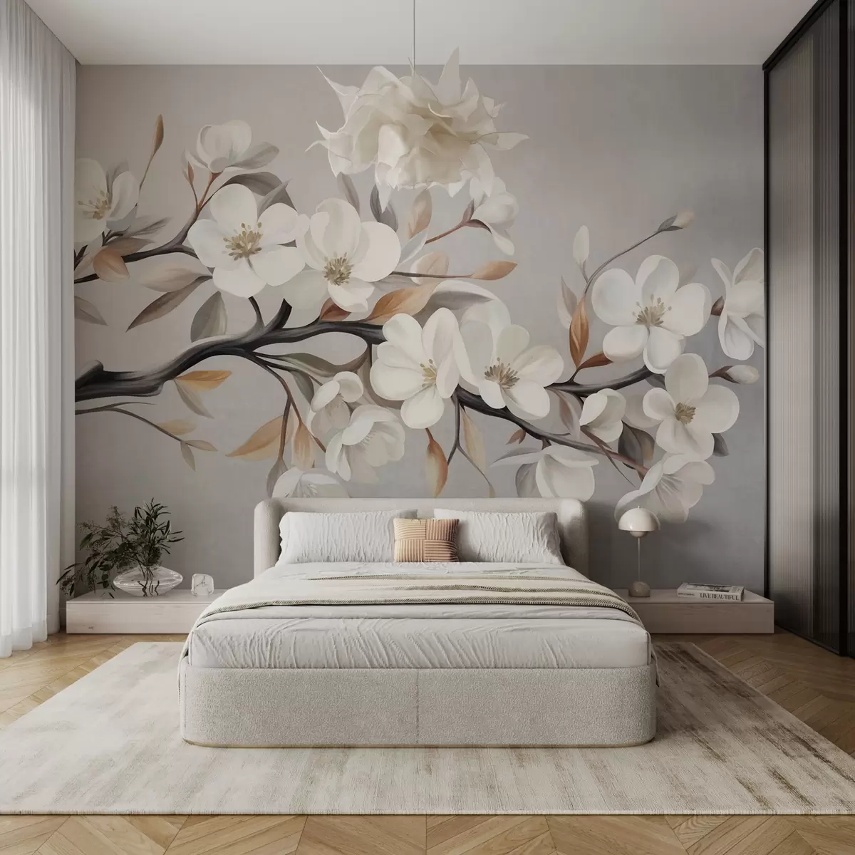 Fototapety Texturovaná větev s bílými květy a hnědými listy na světle šedém pozadí Č. w09817