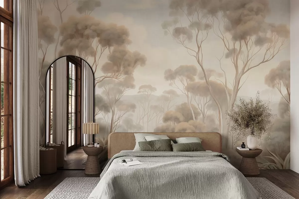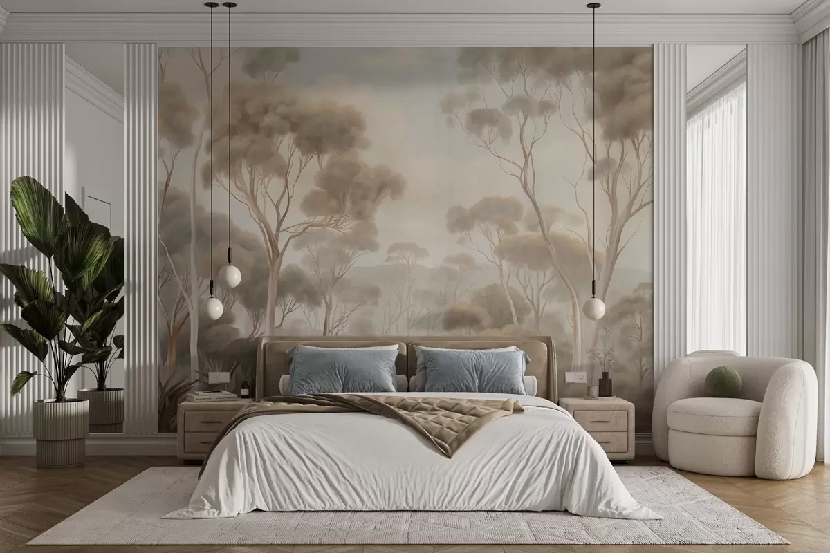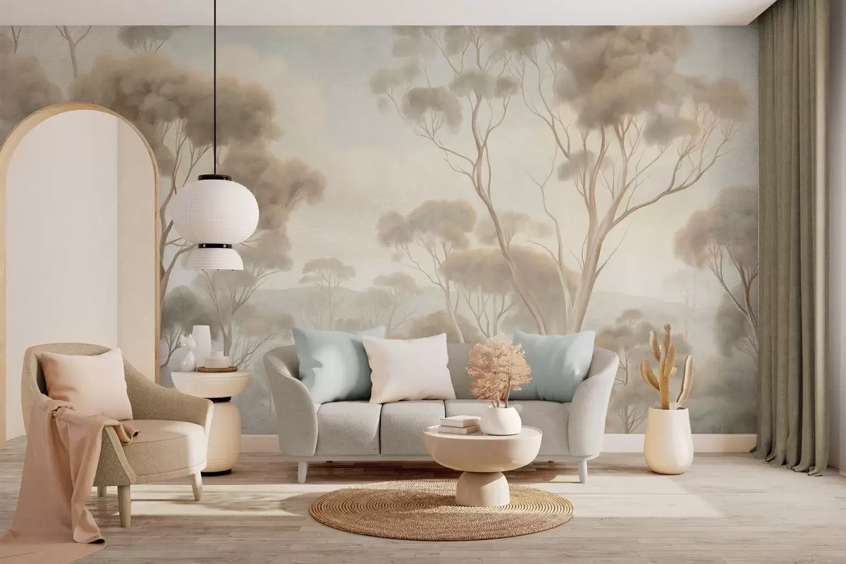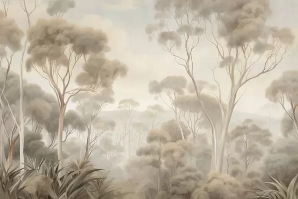Fototapety Mlhavá lesní krajina s vysokými eukalypty a zvlněnými kopci pod zamračenou oblohou, texturované umělecké dílo Č. w09822