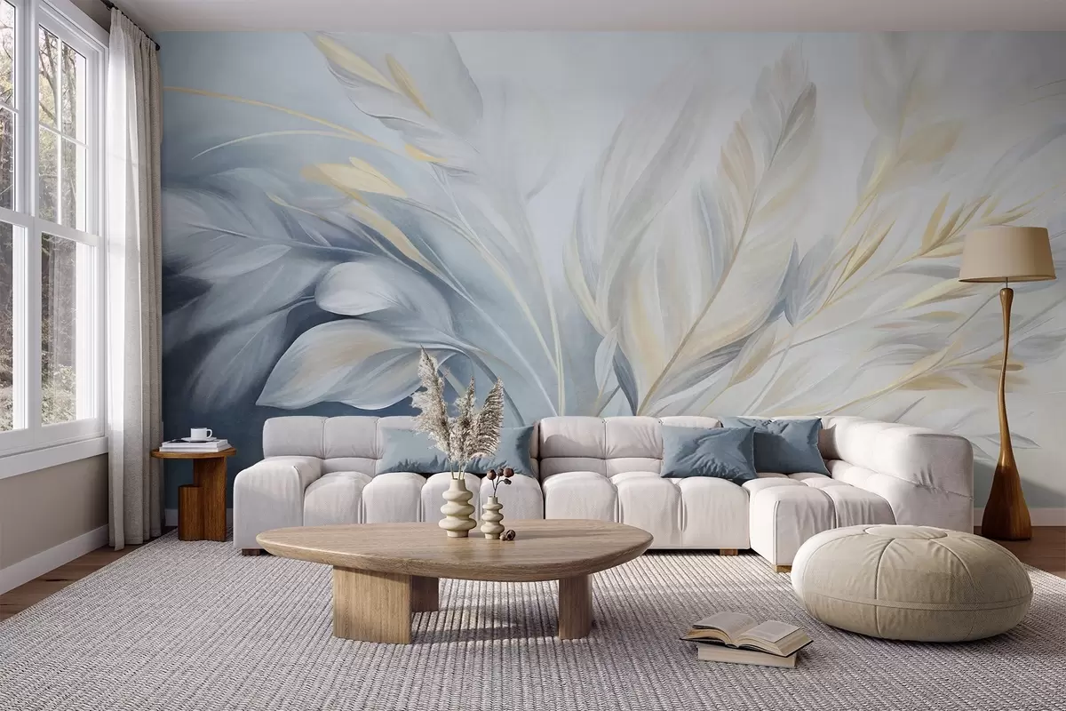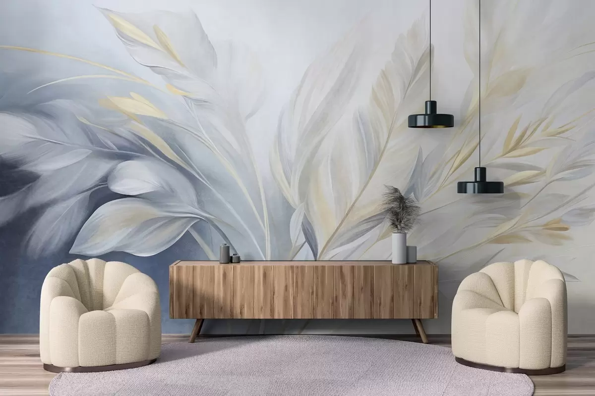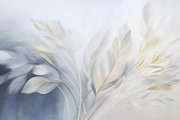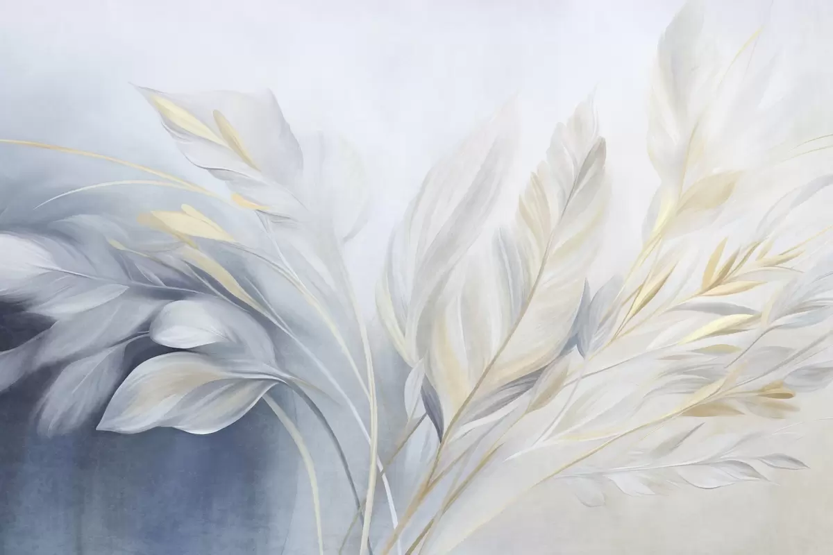 Fototapety Strukturovaná peříčka se žlutými akcenty na jemném pozadí v odstínech světle modré a bílé Č. w09826