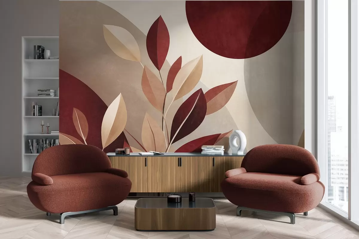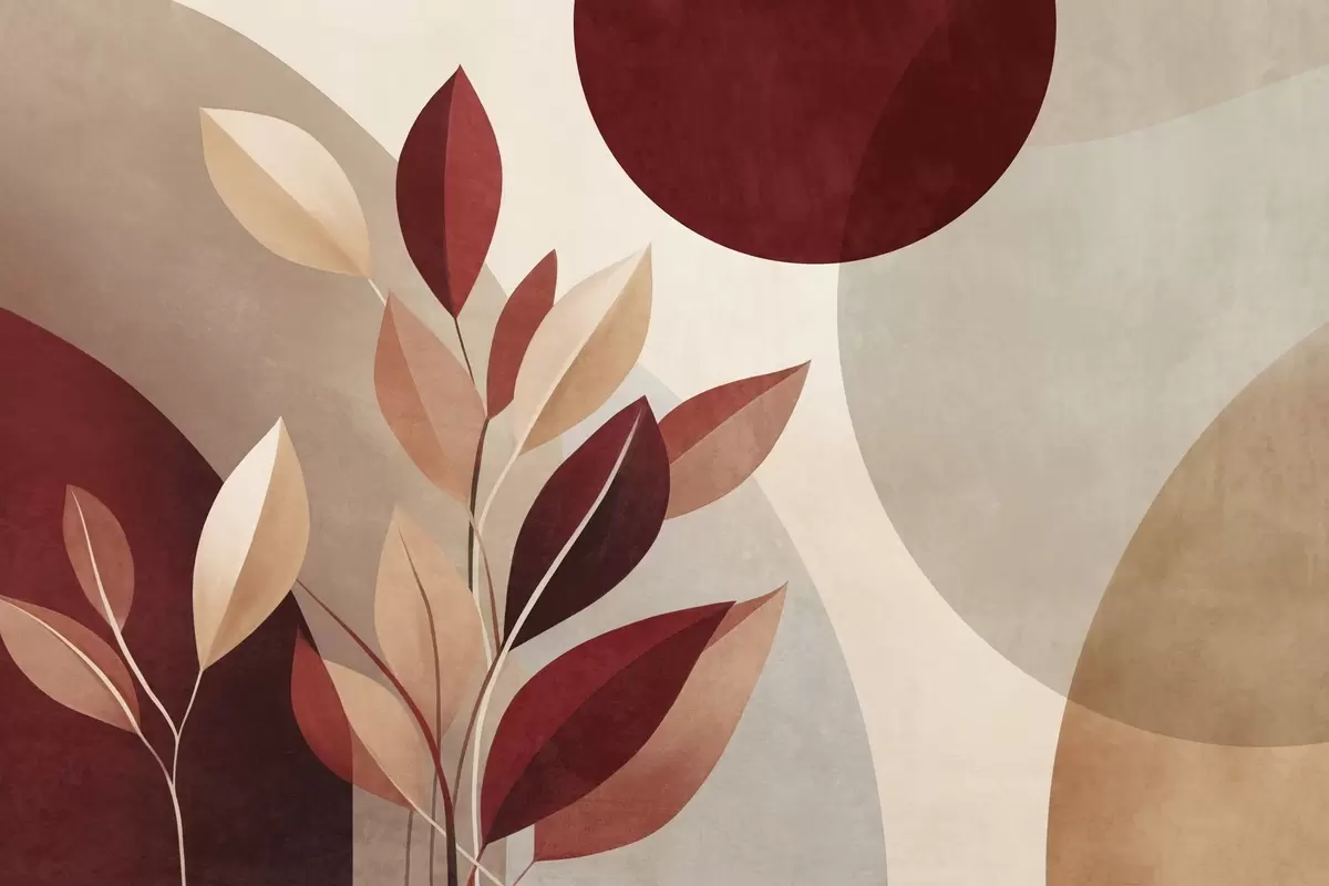 Fototapety Listy s texturou v odstínech vínové a béžové na pozadí abstraktních tvarů, minimalismus, moderní umění Č. w09829