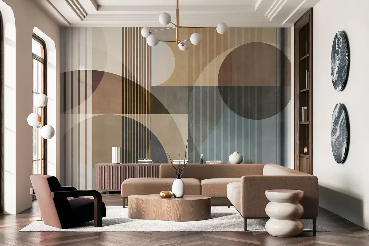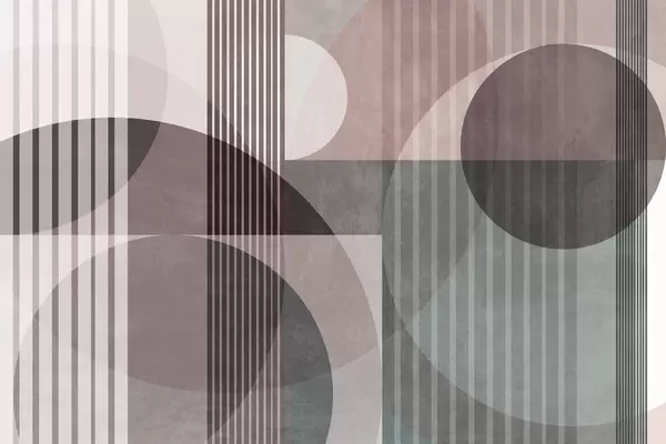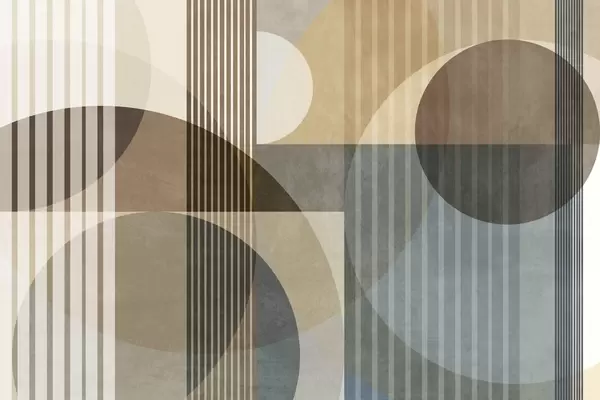 Fototapety Abstraktní geometrické tvary tvořené kruhy a čarami, tlumené zemité odstíny, strukturovaná, vrstvená kompozice Č. w09834