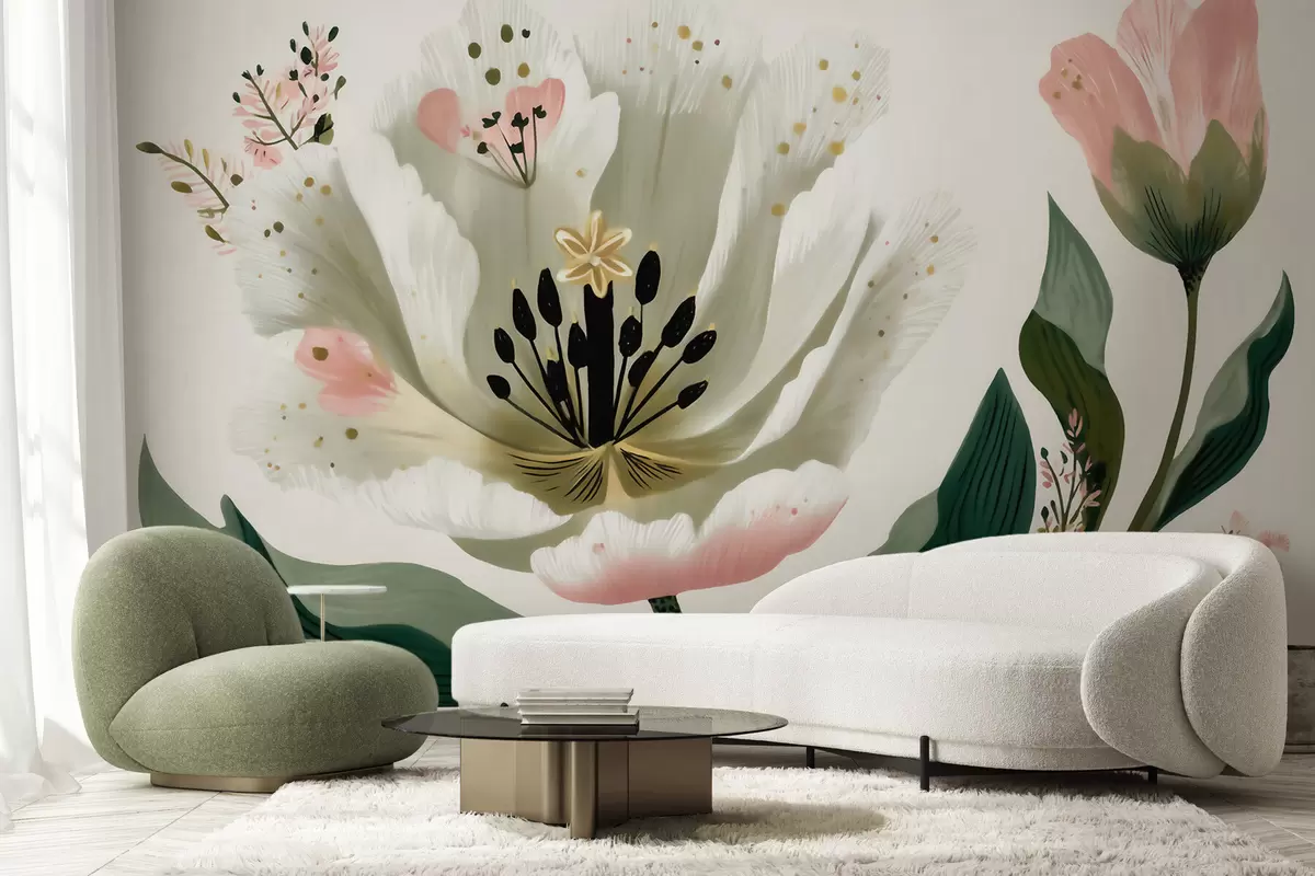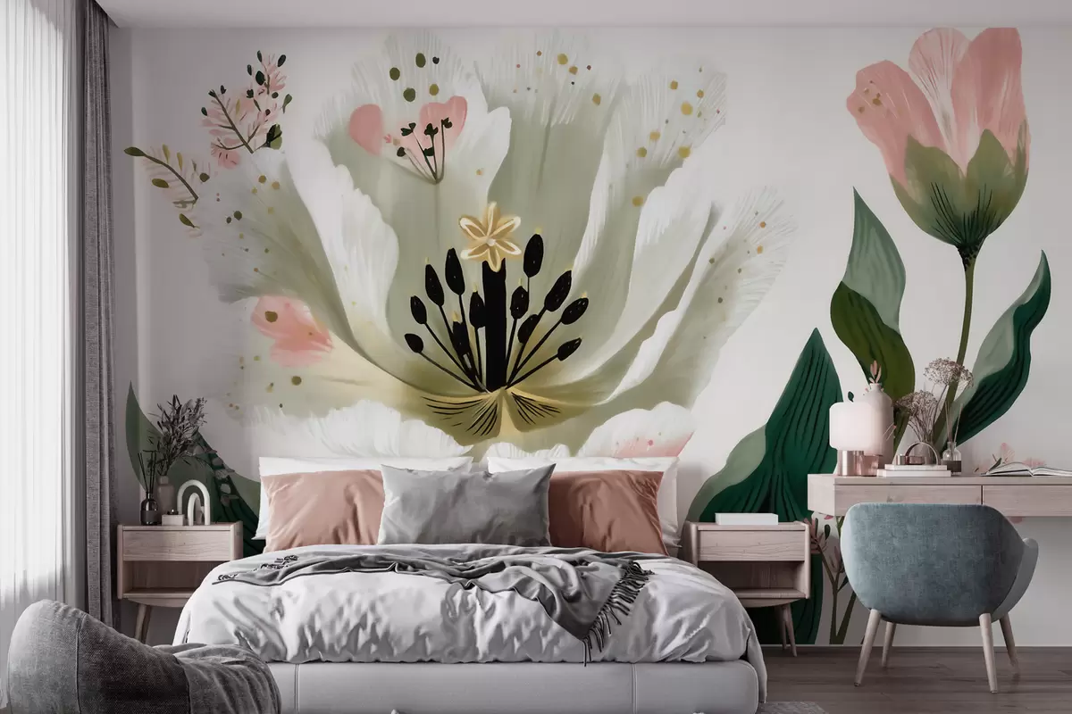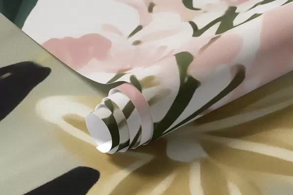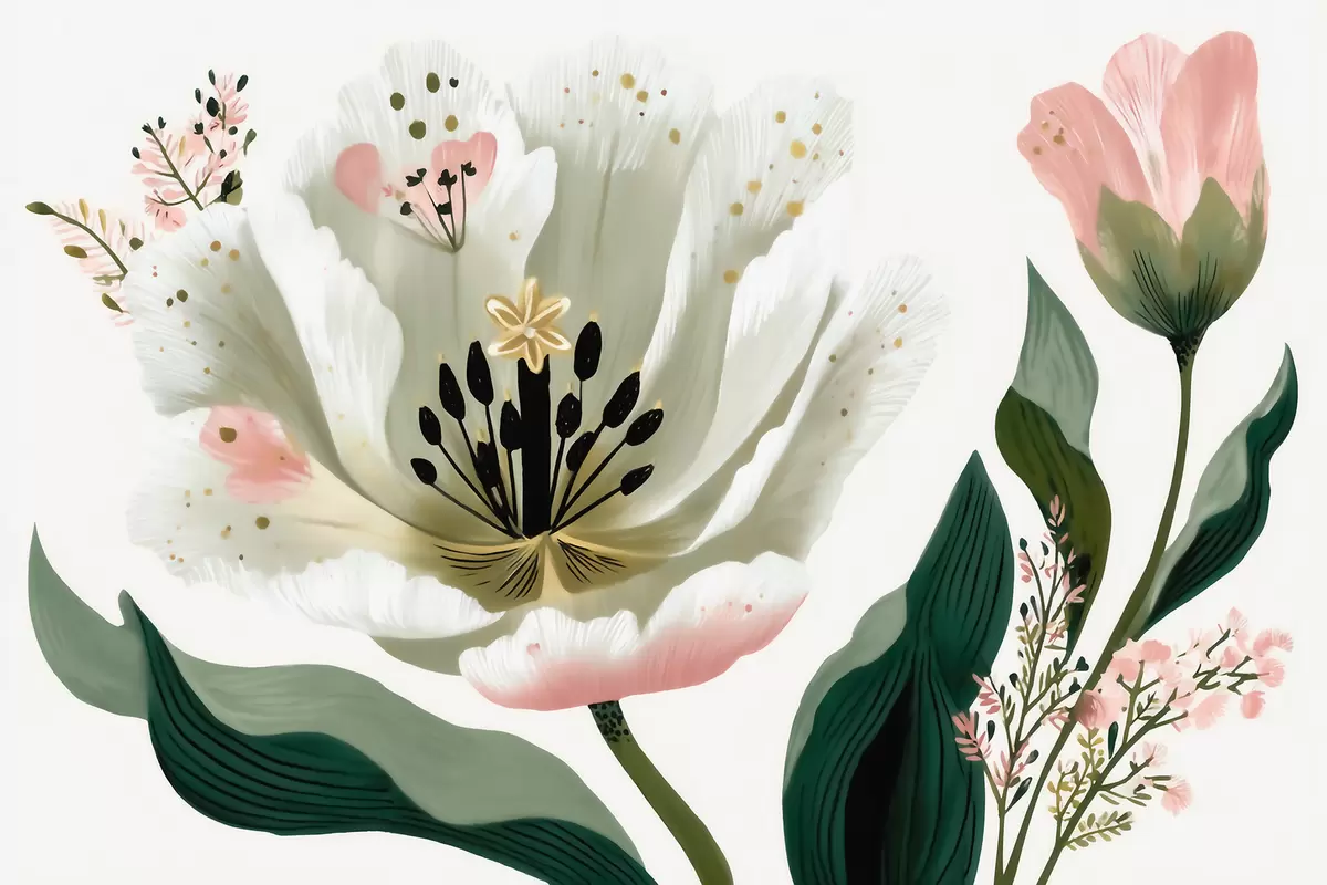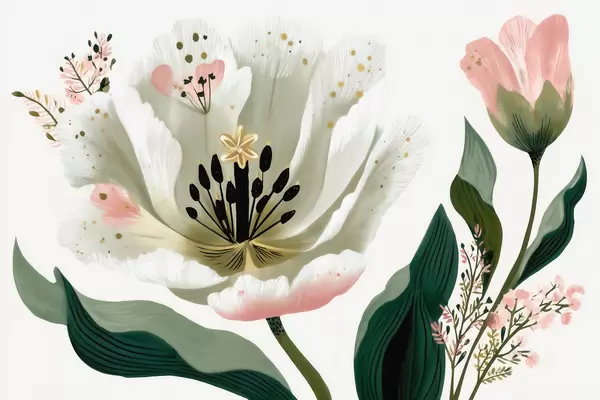 Fototapety Květina se zelenými listy a jemnými růžovými akcenty ve stylu akvarelu Č. w09836