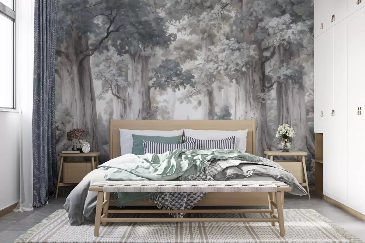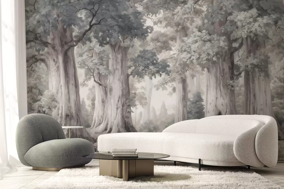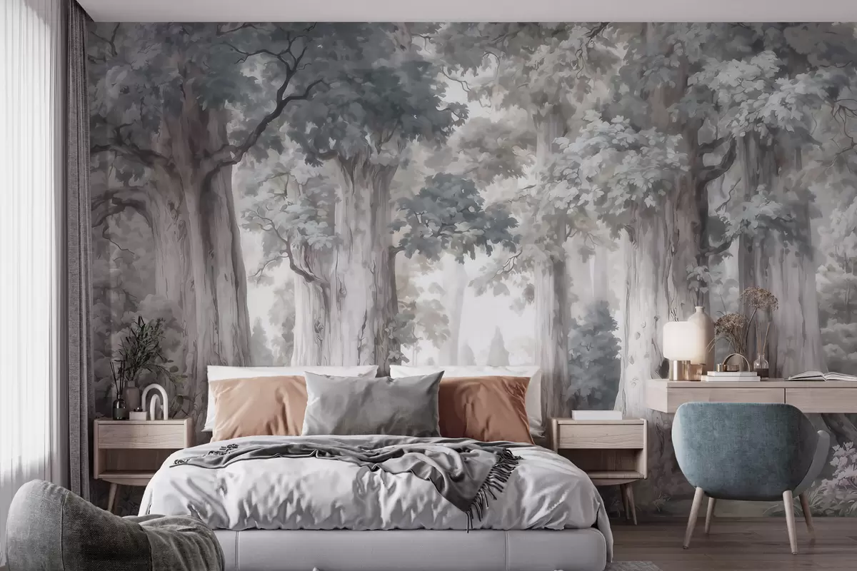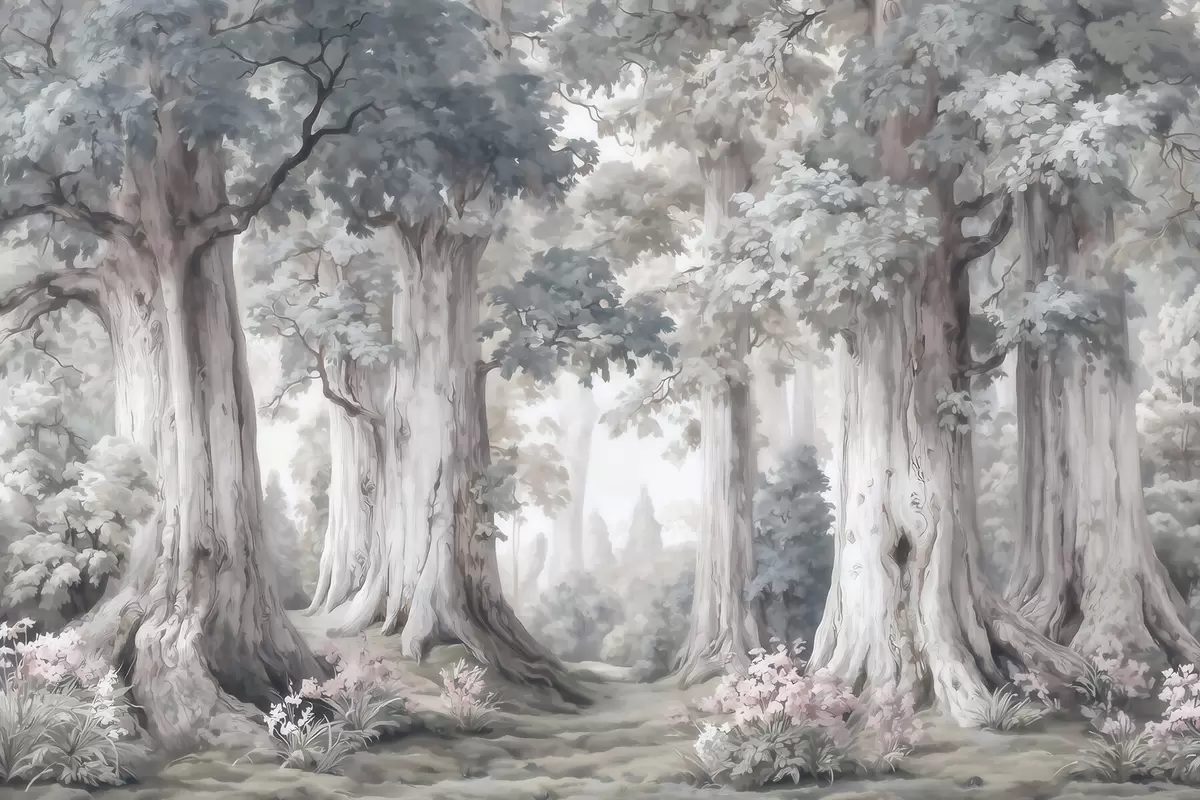 Fototapety Pohádkový les s vysokými stromy a jemnou tlumenou barevnou paletou ve stylu akvarelu Č. w09849