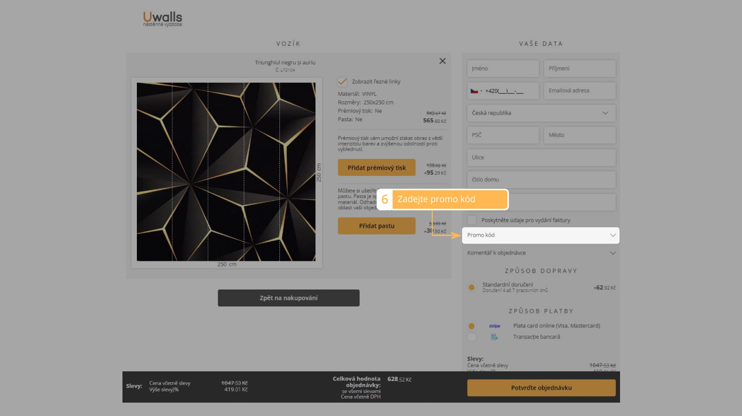 Můžete si prohlédnout částku vaší objednávky (šipka pro zobrazení částky).