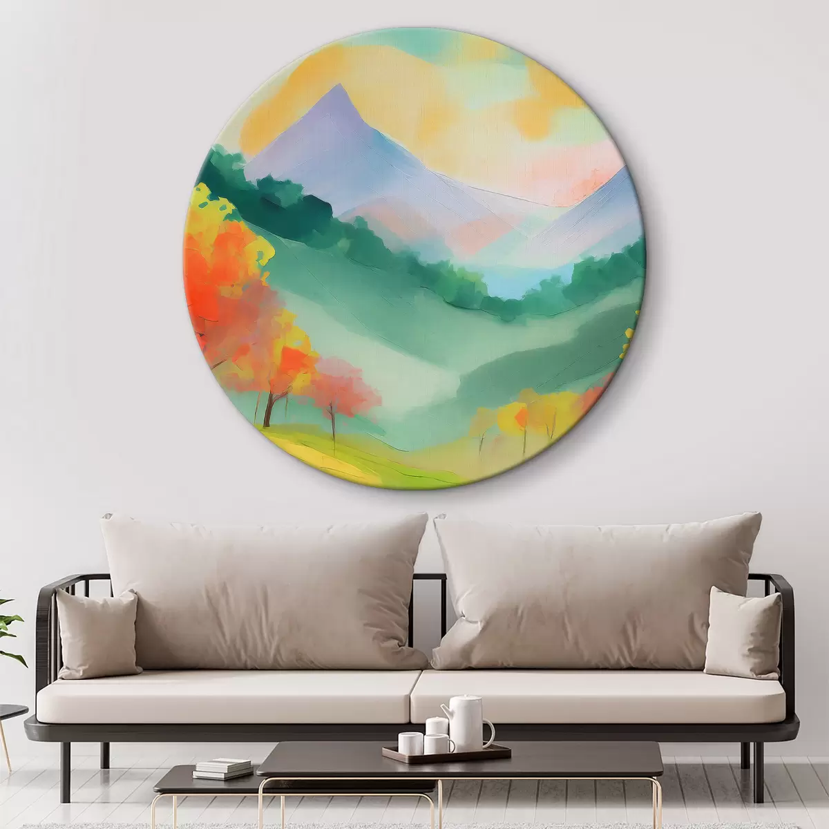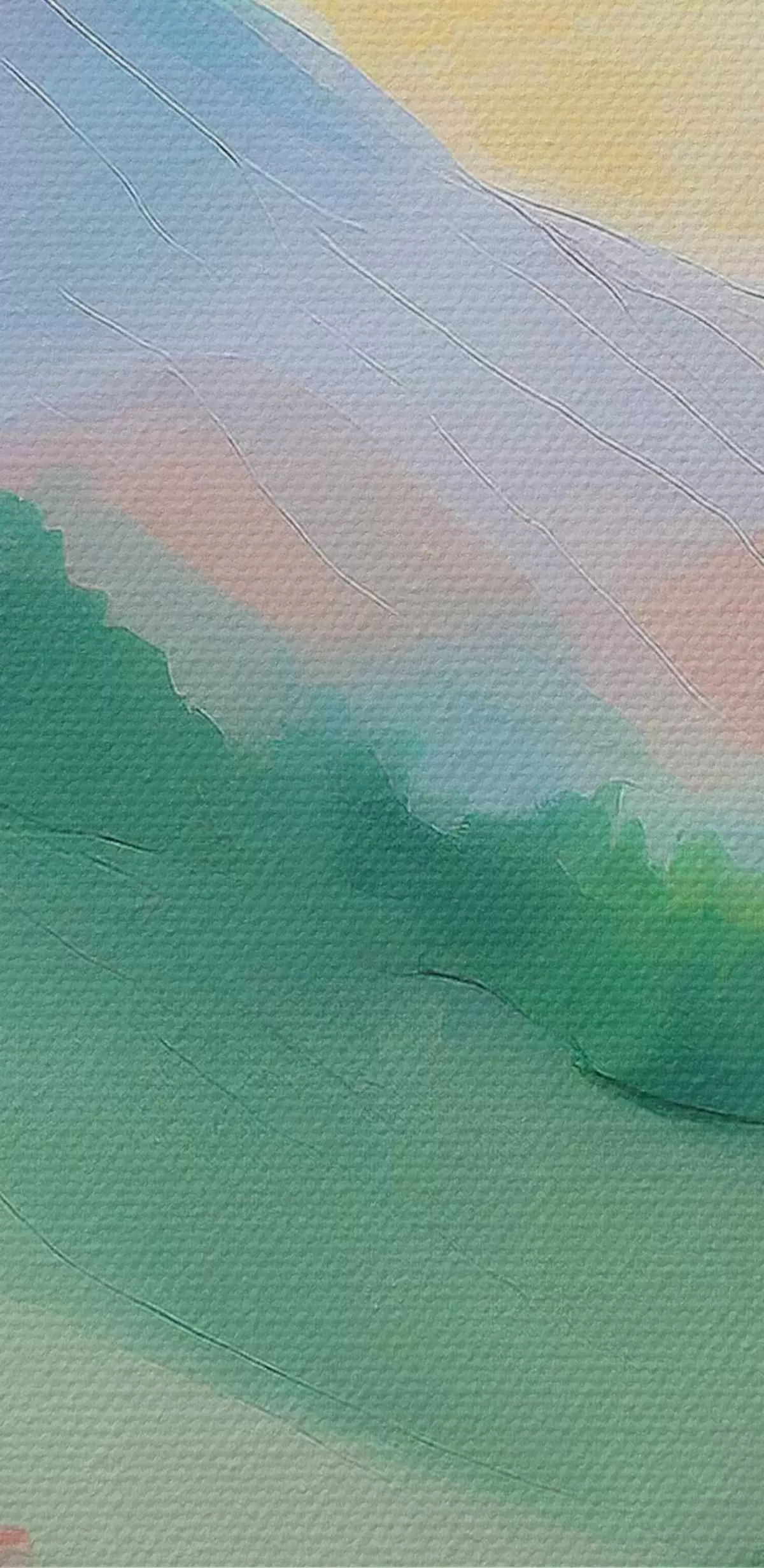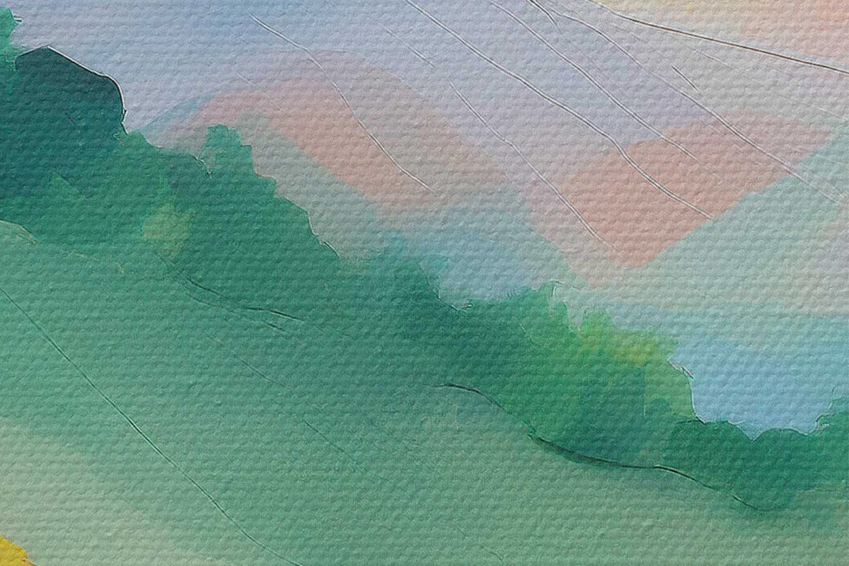 Obrázek Akrylová kresba Přírodní krajina, barvy západu slunce, hory, stromy, louka Nr r36505