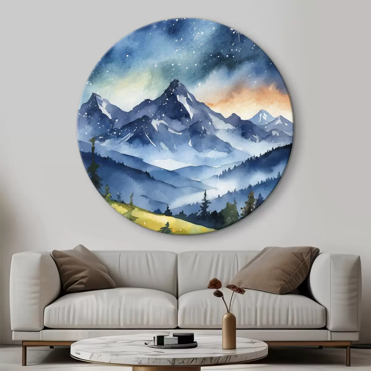 Obrázek Akvarel horská krajina, les, hvězdná noční obloha, barvy západu slunce Nr r37946