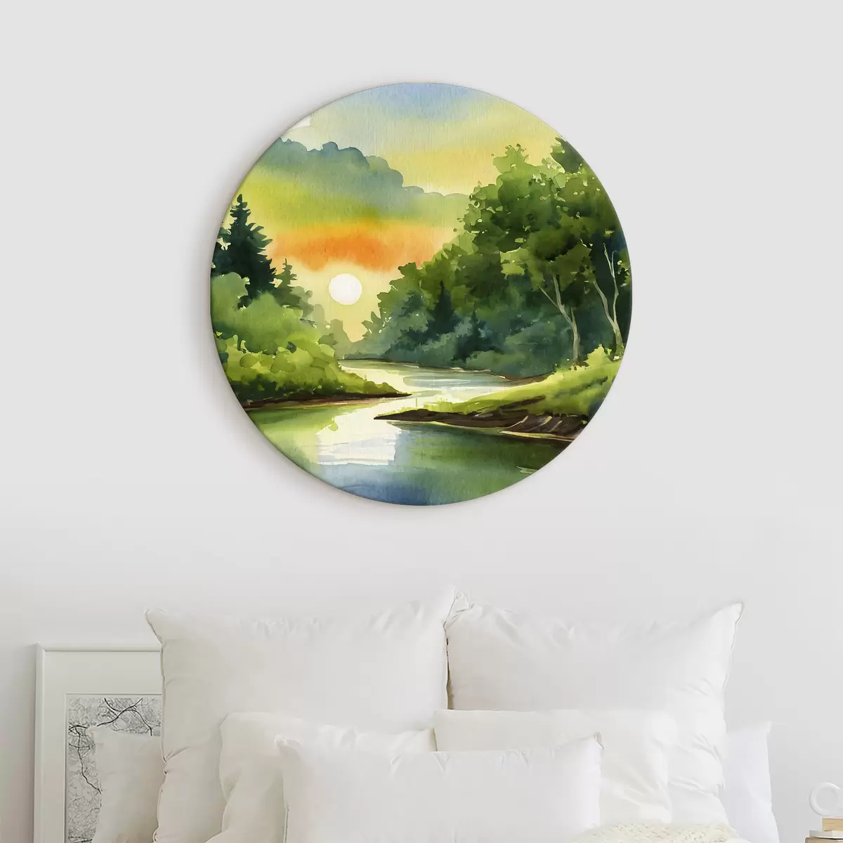 Kulaté obrazy Západ slunce na řece, les, akvarel, západ slunce, zeleň, příroda r37949