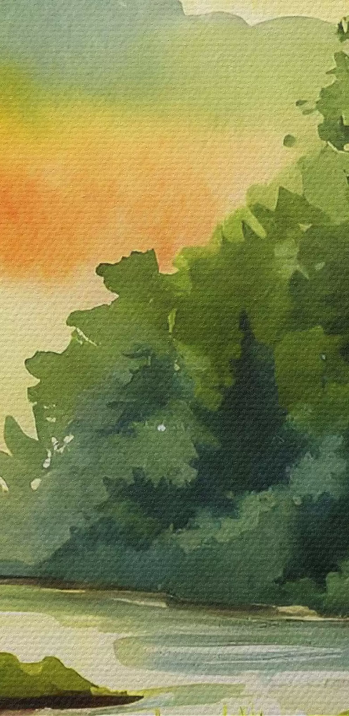 Obrázek Západ slunce na řece, les, akvarel, západ slunce, zeleň, příroda Nr r37949