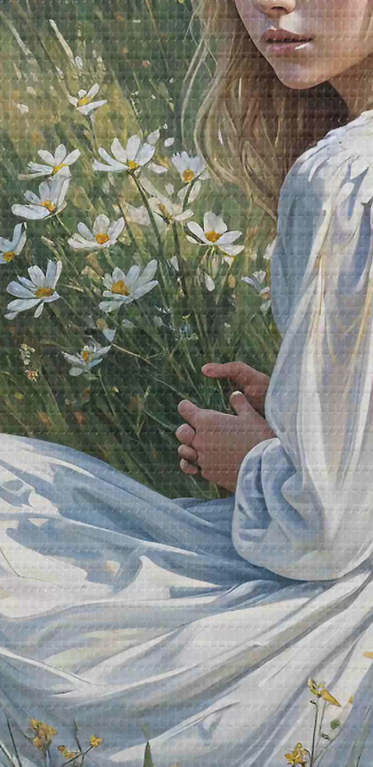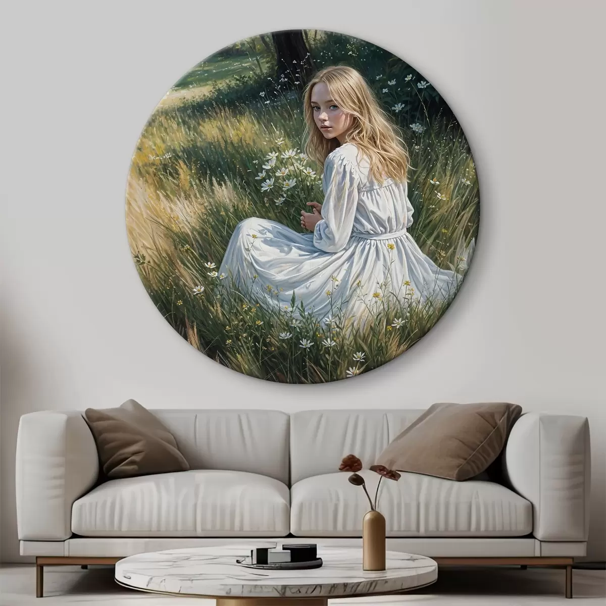 Obrázek Dívka v bílých šatech sedící na poli s květinami Nr r38196